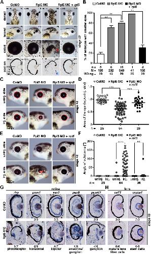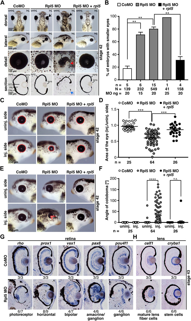 FIGURE 2. Rpl5 MO injection leads to a severe eye phenotype. (A) Xenopus embryos injected with Control MO, Rpl5 MO and Rpl5 MO + rpl5 and evaluated at stage 42. The injected side was compared to the uninjected side. Dorsal, lateral, and detail views, as well as sections are shown. Rpl5 MO-injected embryos developed smaller and malformed eyes (black arrows) in a MO dose-dependent manner. Detailed view of deformed eyes is depicted (red arrow). Section view shows disrupted retinal pigmented epithelium (blue arrow, section orientation is dorsal (upper part) to ventral (lower part)). (B) Statistical analysis of data given in (A). The eye phenotype was rescued by co-injecting 0.5 ng rpl5 RNA. (C) The area of the eye (red dotted line) on the injected side was compared to uninjected side of Control MO, Rpl5 MO, and Rpl5 MO + rpl5-injected embryos at stage 42. (D) Statistical evaluation of data given in (C). Embryos showed significantly smaller eyes upon Rpl5 depletion. This phenotype was rescued upon co-injection of rpl5 RNA. (E) The angle of eye fissure (red lines) of stage 42 embryos was measured and the injected side compared to the uninjected side. (F) Statistical analysis of data given in (E). Rpl5 morphants showed a coloboma phenotype in a large number of individuals. This phenotype was rescued upon co-injecting rpl5 RNA. (G) At stage 43, different cell layers of the retinal lamination were analyzed by whole mount in situ hybridization using well-known marker genes as described in the main text. Transversal sections of Control MO and Rpl5 MO-injected embryos are depicted. Upon Rpl5 knockdown all depicted cell types were delocalized and cell layers are disrupted. Number below the columns indicate the number of embryos showing the depicted phenotype per number of embryos analyzed. Section orientation is dorsal (upper part) to ventral (lower part). (H) celf1, a marker gene for mature lens fiber cells and cryba1, a marker gene for lens stem cells, were analyzed at stage 43 embryos injected with either Rpl5 MO or Control MO. Both lens-specific marker genes were not affected upon Rpl5 MO injection. Number below the columns indicate the number of embryos showing the depicted phenotype per number of embryos analyzed. Section orientation is dorsal (upper part) to ventral (lower part). Abbreviations: CoMO, Control morpholino oligonucleotide; GCL, ganglion cell layer; INL, inner nuclear cell layer, inj., injected; n, number of independent experiments; N, number of injected embryos and analyzed; n.s., non-significant; ONL, outer nuclear cell layer; RPE, retinal pigmented epithelium; Rpl5 MO, ribosomal protein L5 morpholino oligonucleotide; uninj., uninjected. Error bars indicate standard error of the means; **p ⤠0.01, ***p ⤠0.001, ****p ⤠0.0001. |