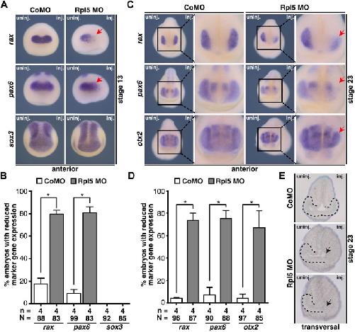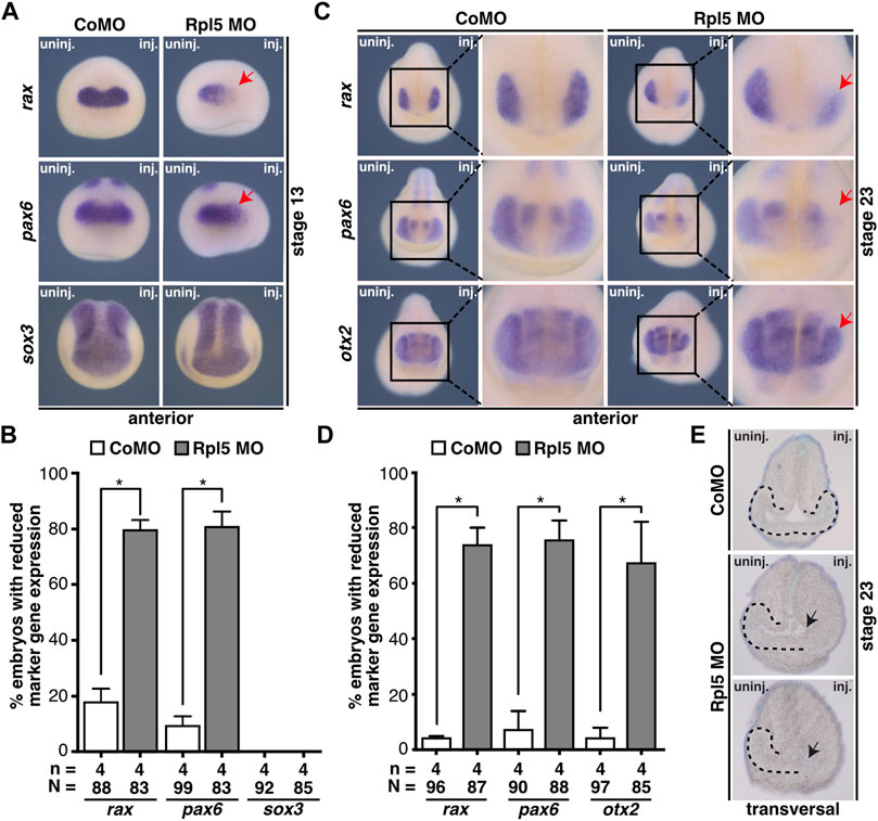 FIGURE 3. Rpl5 knockdown interferes with eye-specific marker expression and eye vesicle evagination. (A) Anterior views of stage 13 embryos are given. By whole mount in situ hybridization the expression of the eye-specific marker genes rax and pax6 and the pan-neural marker gene sox3 was investigated in embryos injected with Control MO or Rpl5 MO. The expression of rax as well as pax6 was reduced upon Rpl5 depletion (red arrows), whereas Control MO injection did not alter the expression. Expression of sox3 was not altered, neither in Control MO nor in Rpl5 MO injected embryos. (B) Statistical analysis of data shown in (A). (C) Anterior views are depicted. At stage 23, Control MO and Rpl5 MO-injected embryos were analyzed regarding the expression of eye-specific marker genes rax, pax6, and otx2 by whole mount in situ hybridization. All three marker genes showed reduced expression in the eye field (red arrows) upon Rpl5 knockdown. Control MO injection did not result in altered gene expression. (D) Statistical analysis showed a significantly reduced expression in all three marker genes. (E) Transversal sections of stage 23 embryos injected with either Control MO or Rpl5 MO are shown. Section orientation is dorsal (upper part) to ventral (lower part). Eye vesicles in embryos injected with Rpl5 MO do not evaginate (indicated by black arrows). Control MO injection do not affect eye vesicle evagination. Eye vesicle is indicated by black dotted line. Abbreviations: CoMO, Control morpholino oligonucleotide; inj., injected; n, number of independent experiments; N, number of injected embryos and analyzed; Rpl5 MO, ribosomal protein L5 morpholino oligonucleotide; uninj., uninjected. Error bars indicate standard error of the means; *p ⤠0.05. |