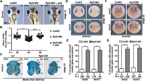 FIGURE 5. Rpl5 MO injection hinders proper development of the cranial cartilage. (A) The head width was measured and the Control MO, Rpl5 MO, or Rpl5 MO + rpl5 RNA-injected side compared to the uninjected side of stage 42 embryos. Blue and red lines indicate measured width; black line represents the embryo midline. (B) Rpl5 depletion led to significantly narrower heads, which was rescued upon rpl5 RNA co-injecting. (C) Cranial cartilage was dissected from stage 45 wildtype embryos and Rpl5 morphants. Rpl5 knockdown resulted in deformed cartilages structures (black arrows) like the Meckelâs cartilage, the tectum anterius, and the branchial arch. Ventral views of cranial cartilages are shown. (D) Anterior views of embryos are depicted. snai2 and twist1 were investigated as marker genes of the neural crest in stage 15 embryos. Reduced marker gene expression is indicated with red arrows. (E) Upon Rpl5 depletion both marker genes were significantly reduced in 80% of the embryos. (F) Anterior views of embryos are given. Expression of snai2 and twist1 were analyzed at stage 20 during NCC migration. Red arrows indicate reduced marker gene expression. (G) Both marker genes showed a significant reduction in expression in around 85% of the Rpl5 MO-injected embryos. Abbreviations: ba, branchial arch; CoMO, Control morpholino oligonucleotide; inj., injected; mc, Meckelâs cartilage; n, number of independent experiments; N, number of injected embryos and analyzed; Rpl5 MO, ribosomal protein L5 morpholino oligonucleotide; ta, tectum anterius; uninj., uninjected; WT, wildtype. Error bars indicate standard error of the means; *p ⤠0.05, ***p ⤠0.001. |
