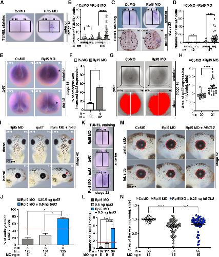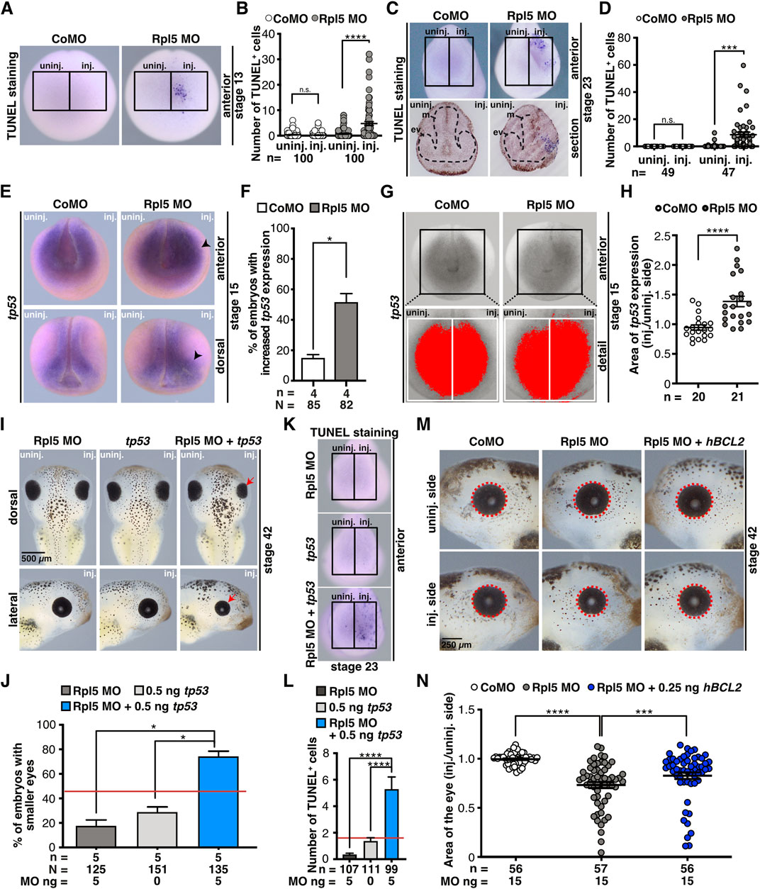 FIGURE 7. Rpl5 depletion affects apoptotic pathways. (A) Late apoptotic cells were stained in stage 13 embryos injected with Control and Rpl5 MO via TUNEL staining. Anterior views are shown. Number of apoptotic cells was counted in the area of the anterior neural plate (black boxes indicate the area where apoptotic cells were counted) and the injected side was compared to the uninjected side. (B) Control MO injection did not increase the number of apoptotic cells. Rpl5 MO injection led to a significantly increased number of apoptotic cells. (C) Anterior views are shown in the upper row. Lower row shows transversal sections of embryos heads [dorsal (upper part) to ventral (lower part) oriented section]. Black dotted line indicates eye vesicle and mesencephalon. Apoptotic cells were detected via TUNEL staining at stage 23 and counted in the anterior part of whole embryos (indicated by black boxes). The injected side was compared to the uninjected side. (D) Upon Rpl5 depletion, embryos depicted an increased number of apoptotic cells in the anterior neural tissue. (E) At stage 15, embryos injected with Control MO or Rpl5 MO were fixed and tp53 expression was analyzed by WMISH. Anterior and dorsal views are given. Increased tp53 expression is indicated by black arrowheads. (F) More than 50% of the embryos showed an increase in tp53 expression upon Rpl5 knockdown. (G) The area of tp53 expression (red area) on the injected side was compared to the uninjected side (white boxes) in stage 15 embryos. (H) Compared to the control group, the area of tp53 increased significantly upon Rpl5 MO injection. (I) 5 ng Rpl5 MO and 0.5 ng tp53 RNA were injected alone and in combination into eight-cell stage embryos. At stage 42, embryos were analyzed regarding a smaller eye phenotype (red arrows). Injection of Rpl5 MO or tp53 RNA alone resulted in smaller eyes in a small number of embryos (18 and 30%). Injection of both resulted in smaller eyes in more than 70% of the embryos. (J) Statistical analysis of data given in (I). Red line indicates sum of embryos showing an eye phenotype injected with 5 ng Rpl5 MO and 0.5 ng tp53 RNA. (K) Embryos were injected with 5 ng Rpl5 MO or 0.5 ng tp53 RNA alone or in combination, fixed at stage 23 and apoptotic cells were stained via TUNEL staining. Anterior view of embryos is given. The number of apoptotic cells was counted in the anterior region (indicated by black boxes). (L) Rpl5 MO and tp53 RNA injection resulted in a low number of TUNEL positive cells. Combined injection shows a high number of TUNEL positive cells. Red line indicates sum of TUNEL positive cells in embryos injected with 5 ng Rpl5 MO and 0.5 ng tp53 RNA. Data of TUNEL staining is depicted after background noise reduction, performed for each injection condition separately. This was achieved by subtracting the average number of TUNEL positive cells of the uninjected side of the nominal number of TUNEL positive cells of the injected side. If this resulted in a negative value, it is reported as zero. (M) At eight-cell stage, embryos were injected with Control MO, Rpl5 MO, or Rpl5 MO together with 0.25 ng hBCL2 RNA and fixed at stage 42. Eye area (red dotted line) was quantitatively measured and injected side was compared to the uninjected side. (N) Control MO injection did not affect the area of the eye, whereas Rpl5 MO injection led to smaller eyes. The combined injection of Rpl5 MO and 0.25 ng hBCL2 significantly increased the area of the eye compared to Rpl5 MO injection alone. Abbreviations: CoMO, Control morpholino oligonucleotide; ev, eye vesicle; hBCL2, human B cell lymphoma 2; inj., injected; m, mesencephalon; n, number of independent experiments; N, number of injected embryos and analyzed; n.s., non-significant; Rpl5 MO, ribosomal protein L5 morpholino oligonucleotide; tp53, tumor protein p53; TUNEL, Terminal deoxynucleotidyl transferase dUTP-biotin nick end labeling; uninj., uninjected. Error bars indicate standard error of the means; *p ⤠0.05, ***p ⤠0.001, ****p ⤠0.0001. |