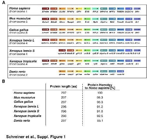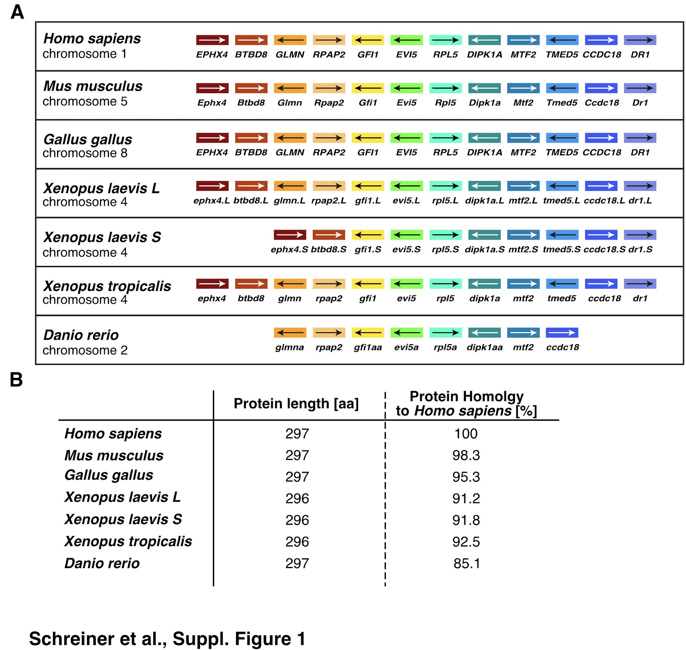 Supplementary Figure S1. Rpl5 synteny analysis and protein comparison between different species. (A) Synteny analysis of rpl5 in Homo sapiens, Mus musculus, Gallus gallus, Xenopus laevis L, Xenopus laevis S, Xenopus tropicalis, and Danio rerio. Comparing the genomic region next to rpl5 showed a conservation across the different species. (B) Protein alignment of Rpl5 of the different species Homo sapiens, Mus musculus, Gallus gallus, Xenopus laevis L, Xenopus laevis S, Xenopus tropicalis, Danio rerio. Protein homology is given in % compared to Homo sapiens. Abbreviations: aa, amino acid; Rpl5, ribosomal protein L5. |