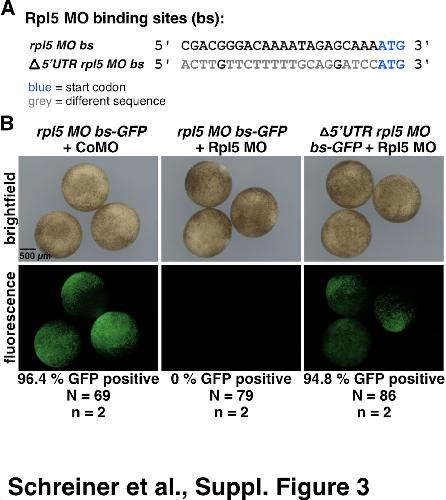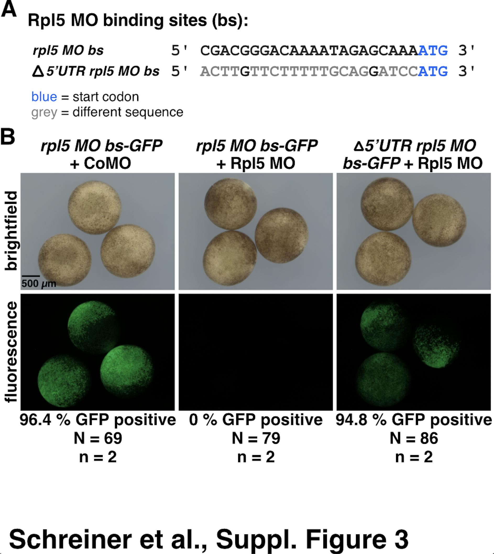 Supplementary Figure S3. Morpholino oligonucleotide binding affinity assay. (A) Binding sites (bs) of Rpl5 MO and the Î5â²UTR rpl5 construct on Xenopus rpl5. Blue letters indicate the start codon. Grey letters indicate differences between Rpl5 MO binding site and the Î5â²UTR rpl5 construct. (B) Binding specificity test of Rpl5 MO. Co-injection of 1 ng rpl5 MO bs-GFP together with 10 ng Control MO led to GFP expression. 1 ng rpl5 MO bs-GFP injected with 10 ng Rpl5 MO efficiently blocked GFP translation. Co-injection of Î5â²UTR rpl5 MO bs-GFP along with 10 ng Rpl5 MO, however, led to GFP expression. Abbreviations: bs, binding site; CoMO, Control morpholino oligonucleotide; GFP, green fluorescent protein; n, number of independent experiments; N, number of injected embryos and analyzed; Rpl5 MO, ribosomal protein L5 morpholino oligonucleotide; UTR, untranslated region. |