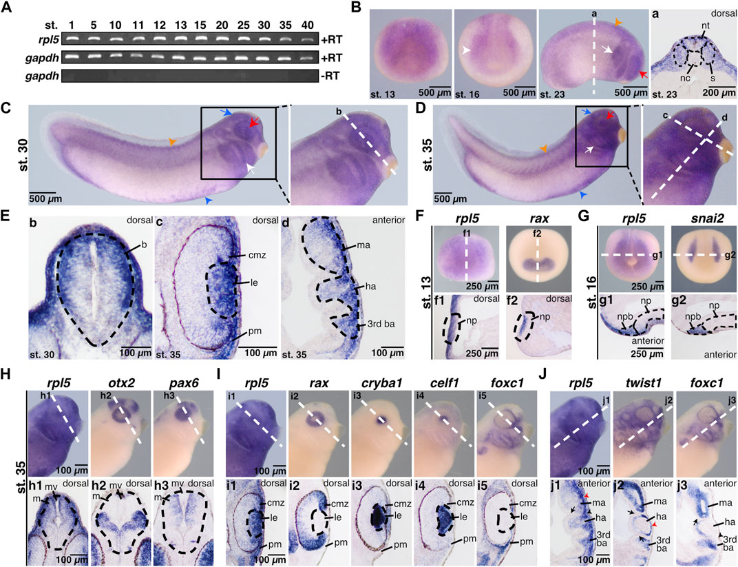 FIGURE 1. Spatial and temporal expression of rpl5 in Xenopus laevis. (A) By reverse transcriptase PCR rpl5 expression was analyzed in entire embryos throughout different developmental embryonic stages (stages 1â40). rpl5 was found to be maternally (stages 1 and 5) and zygotically (stages 10â40) expressed during the entire embryonic development. gapdh served as loading control, gapdh minus reverse transcriptase as negative control. (BâJ) rpl5 expression and expression of different marker genes were visualized by whole mount in situ hybridization in Xenopus laevis at indicated stages. Section orientation is indicated in each figure by âdorsalâ or âanteriorâ for dorsal-vegetal or anterior-posterior orientation, respectively. White dotted lines represent level of sections shown in lowercase letters (a-j3). (B) Anterior views are shown for stage 13 and 16. During neurulation at stages 13 and 16, rpl5 was mainly detected in the anterior neural plate (white arrowhead). At stage 23 (lateral view), rpl5 was expressed in the branchial arches (white arrow), somites (orange arrowhead), and the developing eye (red arrow). (a) Transversal sections show rpl5 expression in the neural tube and somites (indicated by black dotted lines), and the lateral mesoderm. (C,D) Lateral views. During late tailbud stages 30 and 35, rpl5 expression was mainly detected in the developing eye (red arrow), the branchial arches (white arrow), the brain (blue arrow), the somites (orange arrowhead), and the ventral blood islands (blue arrowhead). (E) (b) Transversal section reveals rpl5 expression in the brain (outlined by black dotted line), in which rpl5 is enriched in the dorsal-lateral part of the mesencephalon. (c) Transversal section at stage 35, rpl5 transcripts are found in the lens (outlined by black dotted line), the ciliary marginal zone and the periocular mesenchyme. (d) Longitudinal section is given. rpl5 was expressed in the mandibular, hyoid and third branchial arch (outlined by black dotted line). (F) rpl5 expression in comparison to the marker gene rax at stage 13. Anterior view of embryos is shown. Sagittal sections shown in (f1) and (f2) reveal expression of both genes in the neural plate (outlined by black dotted lines). (G) Expression of rpl5 and snai2 (marker gene for NCCs) at stage 16. Anterior views are given. During NCC induction, rpl5 transcripts are enriched in the neural plate border (outlined by black dotted lines). (g1) and (g2) transversal sections are shown. (H) Expression of rpl5 and the two brain marker genes otx2 and pax6 at stage 35. Lateral views are given. rpl5 expression is mainly enriched in the dorsal part of the mesencephalon as shown in comparison to otx2 and pax6 expression. Brains are indicated by black dotted lines. (h1âh3) show transversal sections. (I) Expression of rpl5 and the four marker genes rax, cryba1, celf1, and foxc1. Lateral views are shown. Transversal sections are given in (i1âi5). rpl5 expression is found in the ciliary marginal zone, where rax is expressed as well (i1,2). rpl5 transcripts are enriched in the lens (indicated by black dotted lines) as seen in comparison to the lens-specific marker genes cryba and celf1 (i1,3,4), and in the NCC-derived periocular mesenchyme like foxc1 (i1,5). (J) Expression of rpl5 and the two NCC marker genes twist1 and foxc1. Lateral views are shown. (j1âj3) represent longitudinal sections. rpl5 is expressed in all three branchial arches (mandibular arch, hyoid arch, and third branchial arch), where twist1 and foxc1 expression is located as well. Cranial placodes and ganglia are indicated by black arrowheads; red arrowheads indicate migrating NCCs and black arrows indicate the endodermal part of the pharyngeal pouches. Abbreviations: b, brain; ba, branchial arch; cmz, ciliary marginal zone; ha, hyoid arch; le, lens; m, mesencephalon; ma, mandibular arch; mv, mesencephalic ventricle; nc, notochord; np, neural plate; npb, neural plate border; nt, neural tube; pm, periocular mesenchyme; RT, reverse transcriptase; s, somites. |