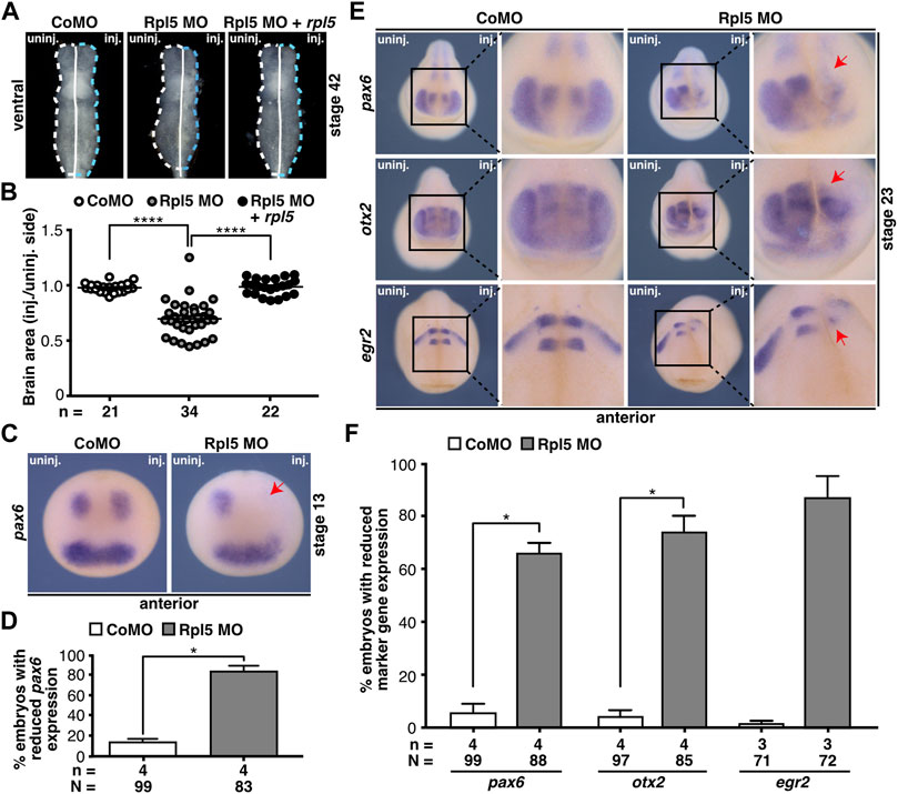 FIGURE 4. Rpl5 depletion affects proper brain development. (A) Brains of Control MO, Rpl5 MO, and Rpl5 MO + rpl5 RNA-injected embryos were dissected, the area of the brains was measured, and injected side was compared to uninjected side. Dotted lines indicate measured area. Ventral views of brains are given. (B) The area of the Rpl5 MO-injected side was significantly smaller compared to the uninjected side. Control MO-injection did not affect the area of the brain. This phenotype was rescued upon co-injecting rpl5 RNA. (C) Anterior views of embryos are depicted. The marker gene pax6 was analyzed in the anterior neural tube of embryos injected either with Control MO or Rpl5 MO. Rpl5 morphants showed a drastic reduction in expression (red arrow) on the injected side in 80% of the embryos, whereas Control MO injected embryos showed no reduction in pax6 expression. (D) Statistical analysis of data shown in (C). (E) Anterior views of embryos are given. At stage 23, the brain-specific marker genes pax6, otx2, and egr2 were investigated by whole mount in situ hybridization in embryos injected with Control MO or Rpl5 MO. In the developing brain, all three investigated marker genes showed reduced expression (red arrows) upon Rpl5 MO injection but not upon Control MO injection. (F) Statistical analysis of data shown in (E). Abbreviations: CoMO, Control morpholino oligonucleotide; inj., injected; n, number of independent experiments; N, number of injected embryos and analyzed; Rpl5 MO, ribosomal protein L5 morpholino oligonucleotide; uninj., uninjected. Error bars indicate standard error of the means; *p ⤠0.05, ****p ⤠0.0001. |