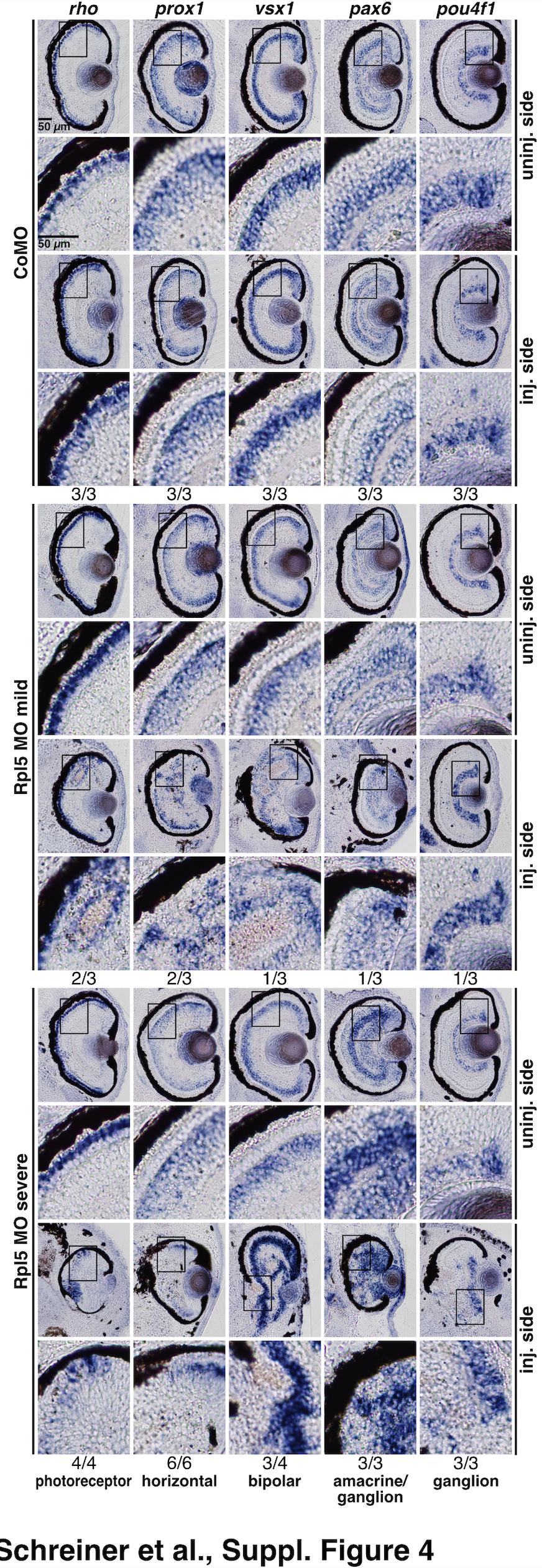 Supplementary Figure S4. Retinal lamination upon Rpl5 knock down in detail. Analysis of retinal lamination specific marker genes, rho, prox1, vsx1, pax6, and pou4f1 in Control MO and Rpl5 MO-injected embryos at stage 43. The entire eye of the uninjected and injected side are shown as well as a detailed view (indicated by black boxes) of the respective cell layer. Control MO injection did not alter the retinal lamination. Rpl5 depletion led to mild and severe phenotypes with disturbed retinal layer and malformed eyes. Number below the columns indicate the number of embryos showing the depicted phenotype per number of embryos analyzed. Abbreviations: CoMO, Control morpholino oligonucleotide; inj., injected; Rpl5 MO, ribosomal protein L5 morpholino oligonucleotide; uninj., uninjected. |