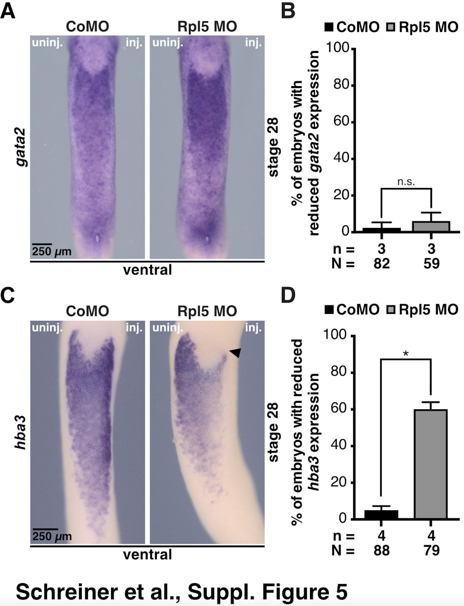 Supplementary Figure S5. Rpl5 depletion affects erythropoiesis. (A) 15 ng Control MO or Rpl5 MO were injected into one ventral blastomere of eight-cell stage embryos to target blood islands. Ventral view of embryos is given. Embryos were fixed at stage 28 and gata2 expression was analyzed via WMISH. (B) gata2 expression was not affected by either Rpl5 MO or Control MO injection. (C) Embryos were injected with 15 ng Control MO or Rpl5 MO into one ventral blastomere at eight-cell stage. Morphants were fixed at stage 28 and hba3 expression was analyzed by WMISH. Ventral view of embryos is shown. Embryos injected with Rpl5 MO show a reduced hba3 expression on the injected side (indicated by black arrowhead), whereas Control MO injection did not reduce hba3 expression. (D) Statistical analysis of data shown in (C). Abbreviations: CoMO, Control morpholino oligonucleotide; inj., injected; n, number of independent experiments; N, number of injected embryos and analyzed; n.s., non-significant; Rpl5 MO, ribosomal protein L5 morpholino oligonucleotide; uninj., uninjected. Error bars indicate standard error of the means; *p ⤠0.05. |