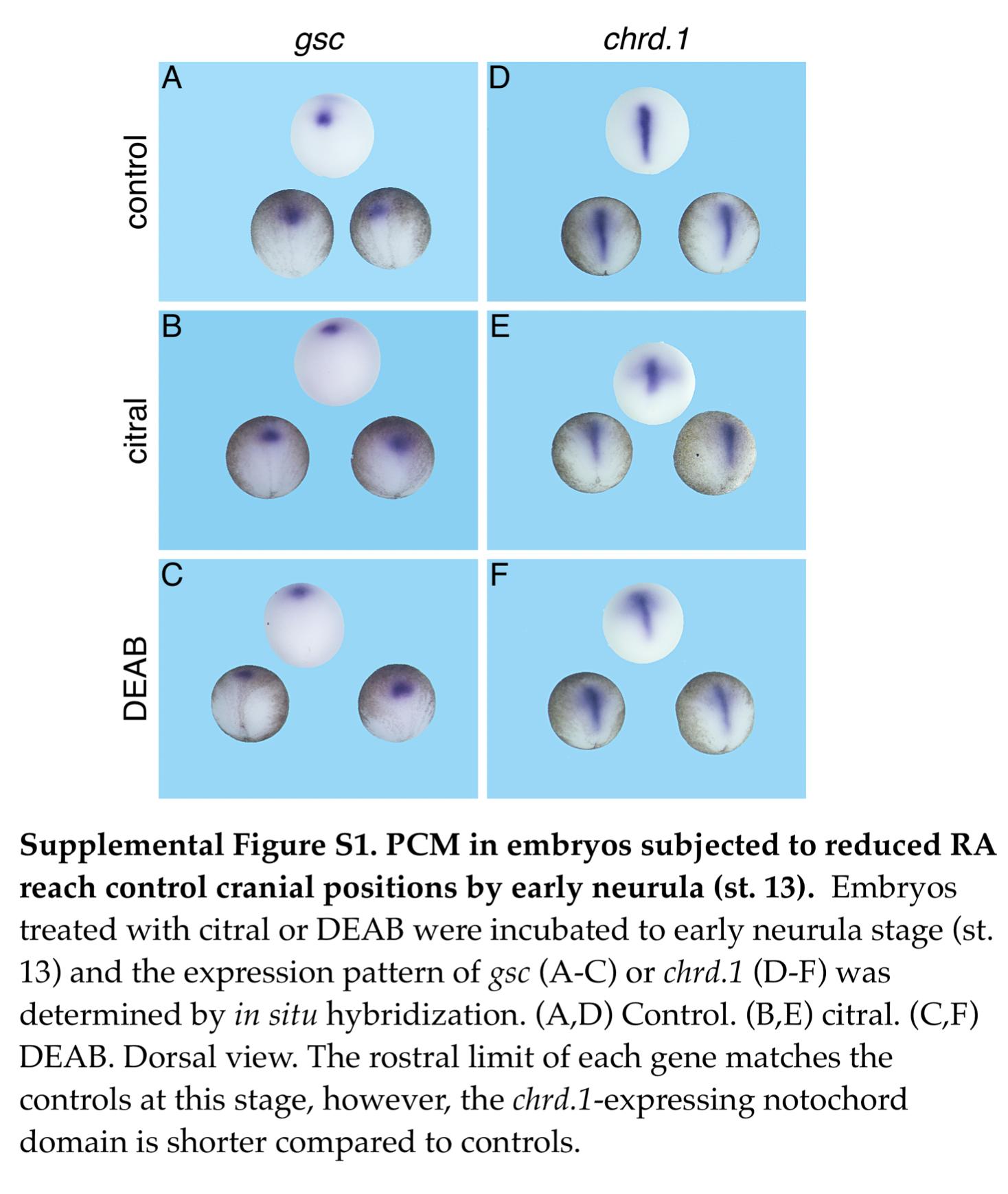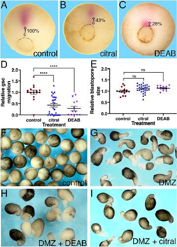 FIGURE 2. RA inhibition delays the rostral migration of the PCM. (AâE) Embryos were treated with citral or DEAB to inhibit the biosynthesis of RA. The extent of migration of the PCM during involution was determined by measuring their distance from the dorsal lip of the blastopore. The PCM cells were identified by gsc in situ hybridization. (A) Control embryo (n = 15). (B) Citral (70 µM) treated embryo (n = 27). (C) DEAB (300 µM) treated embryo (n = 12). (D) Relative PCM migration distribution. The migration distance was normalized to the embryo diameter. (E) Relative blastopore size distribution indicates embryos were at the same developmental stage. For each embryo, we measured its diameter and the diameter of the blastopore and calculated the ratio between them. (FâH) The inhibitory effect of reduced RA signaling was studied in explanted DMZs. RA biosynthesis was inhibited in explanted DMZs by incubation in citral or DEAB until control embryos reached st. 18 (F). (G) Control DMZ explants all had elongated columns of unpigmented mesoderm (n = 34) whereas in DEAB-treated DMZ explants (n = 16) (H) and citral-treated DMZ explants (n = 27) (I) these were missing or stunted. ****, p < 0.0001; ns, not significant.