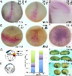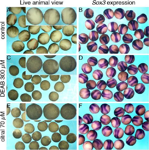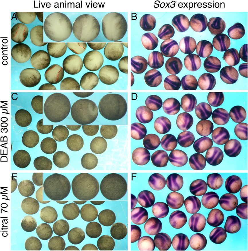 FIGURE 4. Reduced RA signaling affects the apparent location of the neural plate. Embryos were treated with DEAB or citral to inhibit the biosynthesis of RA. At st. 15, embryos were analyzed for the formation of the neural plate while alive by visual examination (A,C,E), or after in situ hybridization with the neural plate marker, sox3 (B,D,F). (A,B) Control embryos (n = 25). (C,D) Embryos treated with DEAB (300 μM; n = 23). (E,F) Treatment of embryos with citral (70 μM; n = 26).
