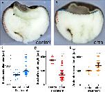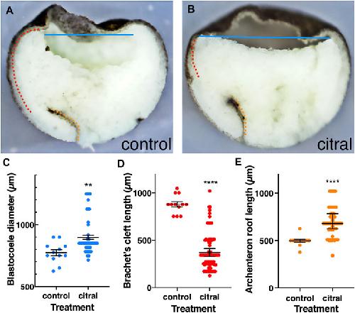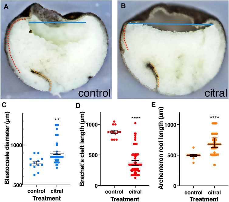 FIGURE 6. Internal reorganization of the embryo as a result of reduced RA signaling. Control (n = 12) and citral-treated (n = 84) embryos were incubated to mid-gastrula (st. 11) and bisected sagittally. (A,B) Control and citral-treated bisected embryos. Blastocoele diameter, blue line; Brachetâs cleft; dotted red line; Archenteron roof, dotted orange line. (C) Distribution of the blastocoel diameter in control and citral-treated embryos. (D) Measurement of Brachetâs cleft length in citral-treated and control embryos. (E) Length of the archenteron roof in citral-treated and control embryos. Citral-treated embryos were compared to the control values. **, p < 0.01; ****, p < 0.0001.