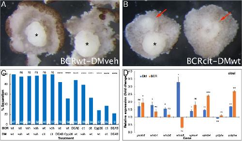FIGURE 7. RA regulates the tissue separation behavior across Brachetâs cleft. Embryos were manipulated to reduce RA signaling levels by treatment with DEAB, citral, or injected with mRNA encoding CYP26A1. For controls, embryos were treated with the diluent alone (veh) for the DEAB or citral dilutions or left untreated (wt). The explanted BCR or DM regions were analyzed separately or conjugated for the separation behavior assay. (A) Control examples of separation behavior assay conjugates between control (wt) BCR and vehicle (veh) treated DM (asterisk). (B) Loss of separation behavior (arrows) when control DM was placed onto BCR treated with citral. * indicates a DM that did remain separated. (C) The extent of separation behavior (%) in all the assays performed in all combinations. # separation/# total: 47/47 DMwt/BCRwt; 40/42 DMveh/BCRwt; 25/26 DMwt/BCRveh; 31/32 DMveh/BCRveh; 40/40 DMcit/BCRwt; 37/37 DMcit/BCRveh; 64/76 DMDEAB/BCRwt; 30/58 DMCyp26/BCRwt; 52/59 DMwt/BCRDEAB; 26/33 DMveh/BCRcit; 18/34 Dmwt/BCRcit; 19/67 DMwt/BCRCyp26; 13/35 DMcit/BCRcit; 2/9 DMDEAB/BCRDEAB. (D) qPCR analysis of pcdh8, efnb1, efnb2, efnb3, epha4, ephb4, pdgfa, and pdgfra gene expression changes in the DM and BCR following citral treatment. **, p < 0.01; ***, p < 0.001; ****, p < 0.0001; ns, not significant.