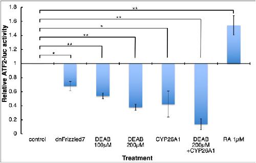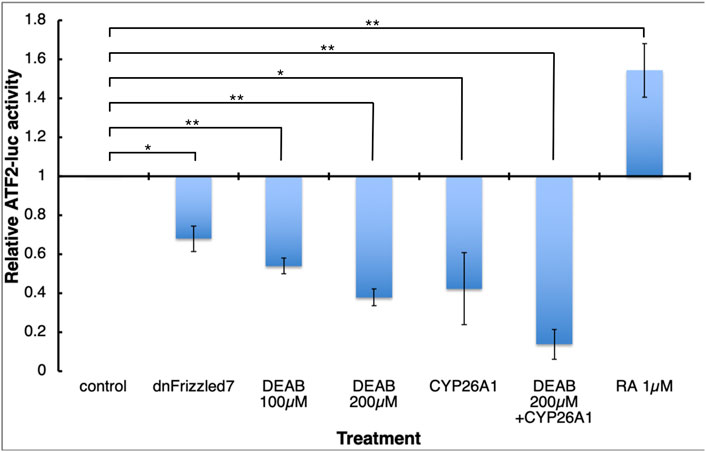 FIGURE 8. RA signaling is necessary for normal Wnt/PCP activity. Embryos were injected with the ATF2-based non-canonical Wnt signaling reporter plasmid and subjected to DEAB or RA treatments, or co-injected with mRNA encoding dominant-negative Frizzled 7 or CYP26A1. During late gastrula (st. 12) embryos were collected and analyzed and the effect on the reporter activity (luciferase) was determined. *, p < 0.05; **, p < 0.01.