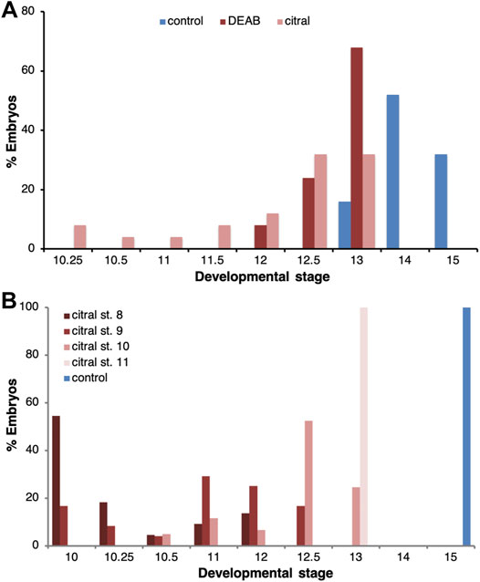 FIGURE 1. Delayed progression through gastrulation as a result of RA biosynthesis inhibition. (A) The progression of embryos through gastrulation treated with DEAB (300 μM; n = 38) or citral (70 μM; n = 39) to inhibit RA biosynthesis. When the majority of control embryos reached early neurula (st. 14/15; n = 38), the stage distribution of the treated samples was determined. The percentage of embryos at each stage in each treatment is shown. (B) The temporal sensitivity window for the delay in gastrulation induced by inhibition of RA biosynthesis was studied by initiating the citral treatment at different developmental stages (8, n = 22; 9, n = 24; 10, n = 61; 11, n = 24). When control embryos reached early neurula (st. 15), the stage distribution of the treated samples was determined. The percentage of embryos at each stage in each treatment is shown.