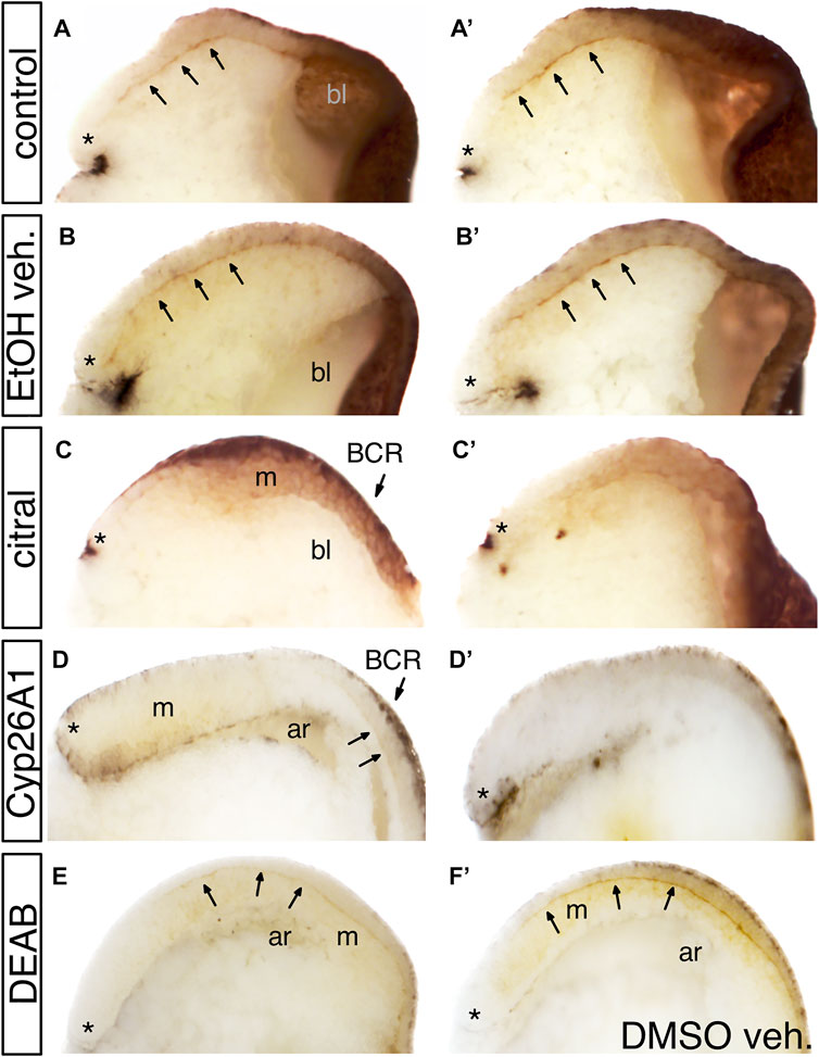 FIGURE 3. The effect of reduced RA signaling on fibronectin (FN) deposition. Embryos were treated with DEAB or citral or injected with RNA encoding CYP26A1 to reduce RA levels. (A,Aâ²) Two examples of untreated sibling control embryos. Arrows point to fibronectin deposited along Brachetâs cleft. * indicates the dorsal lip of the blastopore; bl, blastocoel. (B,Bâ²) Two examples of embryos treated with EtOH vehicle only. FN deposition was equivalent to untreated controls. (C,Câ²) Two examples of embryos treated with citral. FN is detected in the ectoderm of the blastocoel roof (BCR) and mesoderm (m), but is not deposited along Brachetâs cleft. (D,Dâ²) Two examples of embryos injected with cyp26a1 mRNA. FN is not detected in the BCR, the mesoderm (m), or Brachetâs cleft (arrows). ar, archenteron. (E) Embryo treated with DEAB showed reduced FN staining along Brachetâs cleft compared to a sibling embryo treated only with DMSO vehicle (F).