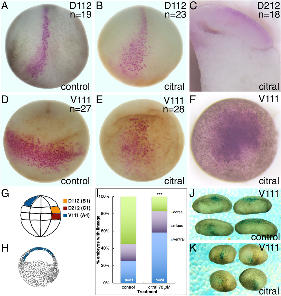 FIGURE 5. Reduced RA signaling does not alter the dorsal-ventral axis. Single 32-cell blastomeres were injected with lineage tracer mRNA and labeled clones mapped at different developmental stages. (A,B) At stage 15, the D112/B1 clone (pink cells) occupies the medial and anterior neural plate in both untreated control (A) and citral treated (B) embryos. Dorso-anterior views. (C) The D212/C1 blastomere that normally contributes to the involuting dorsal mesoderm at gastrulation (st 10.5; Bauer et al., 1984) also does so in citral-treated embryos. Mid-sagittal section with anterior to the left and dorsal to the top. (D) At stage 17, the V111/A4 clone in untreated control embryos forms a coherent ventrolateral clone. Ventral view with anterior to the top. (E) In citral-treated sibling embryos, the stage 17 V111/A4 clone remains medial, i.e., has not expanded laterally, and the cells are more dispersed. Ventral view with anterior to the top. (F) At gastrula stages (st 10.5), the V111/A4 clone in citral-treated embryos occupies the blastocoel roof, similar to control embryos (cf. H). (G) Location of the 32-cell blastomeres that were lineage traced. Dorsal to the right, animal to the top. (H) Location of the V111/A4 clone (blue cells) at early gastrulation, modified from Bauer et al. (1984). Animal to the top and dorsal to the right. (I) Percentage of embryos in which the V111/A4 clone was located predominantly in the dorsal, ventral, or both (mixed) epidermis at tailbud stages. (J) Examples of control embryos showing V111/A4 descendants (blue cells) mostly in the dorsolateral epidermis. Dorsal to the top, anterior to the left. (K) Examples of citral treated embryos showing V111/A4 descendants (blue cells) mostly in the ventral and ventrolateral epidermis. Dorsal to the top, anterior to the left.