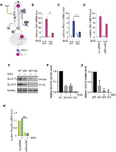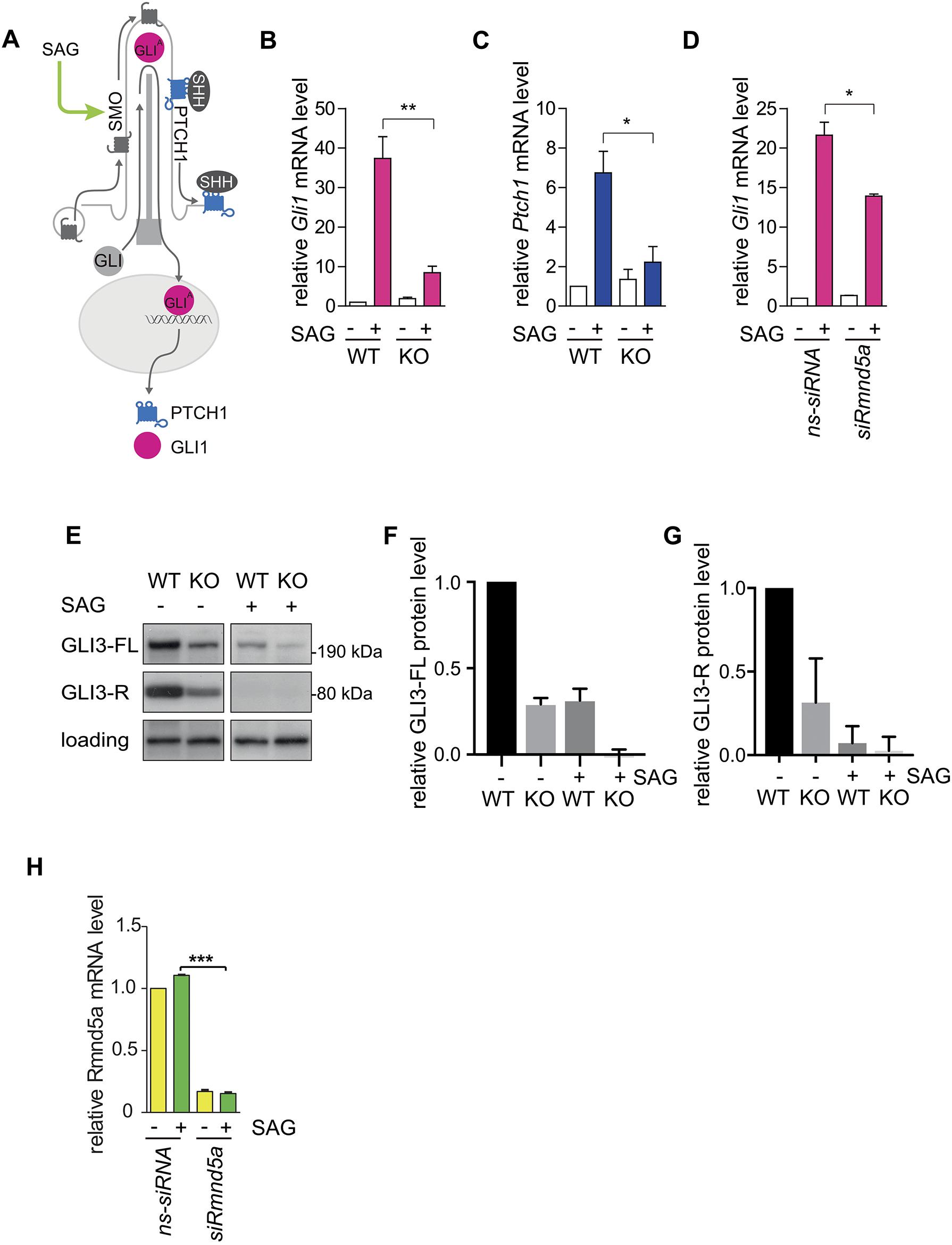 Fig. 3. GID deficiency interferes with SHH signaling. (A) Schematic representation of primary cilium-dependent SHH signaling in the âon stateâ. After binding of SHH ligand to PTCH1, it relieves the inhibition of smoothened (SMO). Then, GLI transcription factors are activated (GLIA), turning on expression of downstream genes, such as Gli1 and Ptch1. (BâD) qPCR of two SHH signaling markers (Gli1 in B,D; Ptch1 in C) during RMND5A KO (B,C) or knockdown (D). Cells were cultured under cilia-induced conditions (high glucose DMEM, 0.5% FCS) with or without SAG (100 nM) treatment for 24 h and harvested for further analysis. ns-siRNA, control siRNA; siRmnd5a, RMND5A knockdown. Mean±s.e.m., n=3. *P<0.05; **P<0.01 (two-tailed, unpaired Studentâs t-test). (E) Western blot of GLI3 (same blot and exposure time). WT and KO cells were cultured under cilia-induced conditions (high glucose DMEM, 0.5% FCS) with or without SAG (100 nM) treatment for 24 h and harvested. A protein that cross-reacted with the GLI3 antibody was used as a loading control. (F,G) Quantification of western blots as in E showing relative protein level of GLI3 full-length form (F) and of GLI3 repressor form (G) in NIH-3T3 WT and RMND5A KO cells. Signal intensities of all lanes were measured on the same western blot with same exposure times and are normalized to the WT âSAG condition. WT âSAG, GLI3-FL/GLI3-R=1.51; KO âSAG, GLI3-FL/GLI3-R=1.4. Data are mean±s.e.m. of n=3. (H) qPCR of Rmnd5a mRNA during RMND5A knockdown. Cells were cultured under cilia- induced conditions (high glucose DMEM, 0.5% FCS) with or without SAG (100 nM) treatment for 24 h and harvested. Data are mean±s.e.m. of n=3. ***P<0.001 (two-tailed, unpaired Studentâs t-test). Knockdown efficiency showed an 85% reduction of Rmnd5a mRNA. |