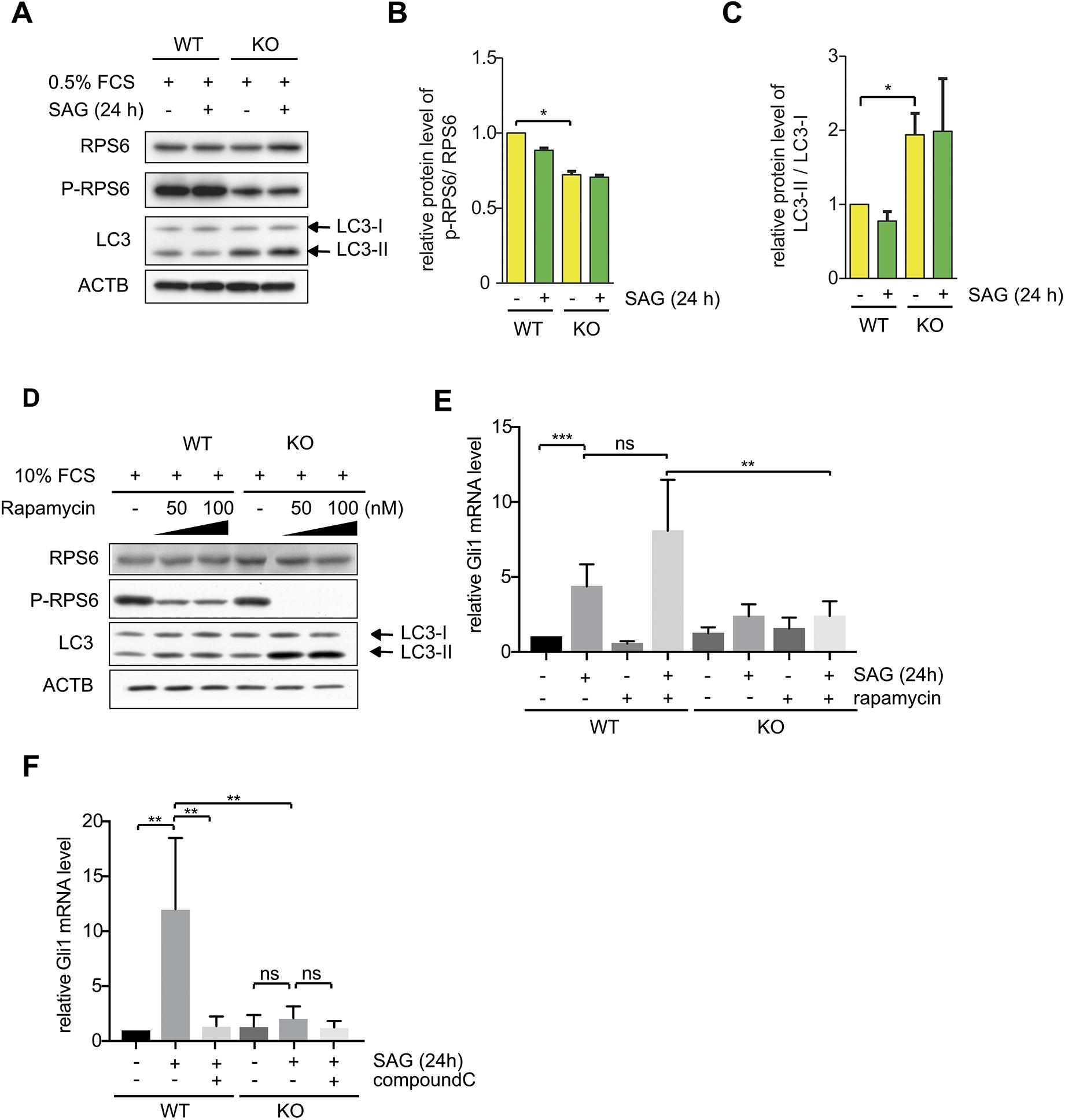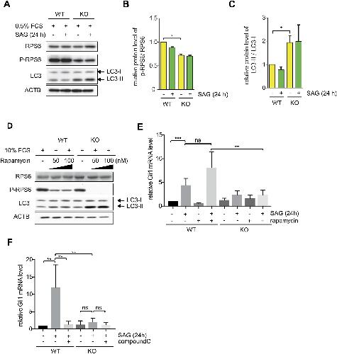Fig. 4. Reduction of SHH signaling is independent of the AMPKâMTOR signaling axis. (A) Western blot analysis of NIH-3T3 WT and RMND5A KO cell extracts with the markers of the MTORâautophagy pathway RPS6, p-RPS6 and LC3. Cells were cultured under cilia-induced condition (high glucose DMEM, 0.5% FCS) with or without SAG (100 nM) treatment for 24 h. ACTB (β-actin) was used as a loading control. LC3, microtubule-associated protein 1A/1B-light chain 3; LC3-I, unlipidated cytosolic form of LC3; LC3-II, PEI-conjugated LC3 protein. (B,C) Quantification of western blotting as in A, showing the relative ratio between p-RPS6 and RPS6 (B), and between LC3-II and LC3-I (C). Data are mean±s.e.m., n=3. *P<0.05 (two-tailed unpaired Studentâs t-test). (D) Western blot analysis of NIH-3T3 WT and KO cell extracts with the markers of the MTORâautophagy pathway RPS6, p-RPS6 and LC3. Cells were cultured under non-starvation conditions (high glucose DMEM, 10% FCS) with or without rapamycin (50 nM or 100 nM) treatment for 24 h. ACTB was used as a loading control. Blots are representative of three individual experiments. (E) qPCR of relative mRNA levels of the SHH signaling marker Gli1 during rapamycin treatment. WT and KO cells were cultured under cilia-induced condition (high glucose DMEM, 0.5% FCS) with SAG (500 nM) and rapamycin (1 μM) treatment for 24 h as indicated. Mean±s.e.m., n=5. **P<0.01; ***P<0.001; ns, not significant (two-tailed unpaired Studentâs t-test). (F) qPCR of relative mRNA levels of the SHH signaling marker Gli1 during compound C treatment. WT and KO cells were cultured under cilia-induced condition (high glucose DMEM, 0.5% FCS) with SAG (100 nM) and compound C (10 μM) treatment for 24 h as indicated. Mean±s.e.m., n=6. **P<0.01; ns, not significant (two-tailed unpaired Studentâs t-test). |