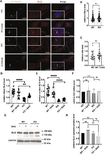Fig. 5. Reduction of GID complex function results in aberrant protein homeostasis in primary cilia. (A) Representative microscope images of GLI2 localization. WT and KO cells were treated with cilia-inducing medium (high- glucose DMEM with 0.5% FCS) for 24 h with or without SAG and then fixed. Axonemes were stained with anti-acetylated TUBA4A (ac-tubulin) antibody (green); anti-GLI2 antibody (red) was used to visualize GLI2 protein, and DAPI (blue) was used to stain DNA. Inset images show magnification of a primary cilium. Scale bars: 20 μm. (B) Relative ciliary area of WT and KO. Relative cilia area was measured in the area demarcating the axoneme (green) in WT and KO cells, and the WT average set to 1. Mean±s.e.m.; n=90 (WT), n=90 (KO). ns, P>0.05 (two-tailed, unpaired Studentâs t-test). (C) Relative ciliary area of WT and WT+SAG. Relative cilia area was measured in the area demarcating the axoneme (green) in WT and WT+SAG cells, with the WT average set to 1. Mean±s.e.m.; n=30 (WT), n=30 (KO). ns, P>0.05 (two-tailed, unpaired Studentâs t-test). (D) Relative ciliary GLI2 protein level. GLI2 (red) and ac- Tubulin (green) fluorescence intensity was measured in the area demarcating the axoneme (green) in WT and KO cells with or without SAG (100 nM). Intensity was normalized to the level of ac-tubulin. Mean±s.e.m.; n=30 (WT), n=30 (WT+SAG), n=30 (KO), n=30 (KO+SAG). ****P<0.0001; **P=0.0038 (two-tailed, unpaired Studentâs t-test). (E) Relative nuclear GLI2 protein level. GLI2 fluorescence intensity (red) was measured in the area demarcating the nucleus (blue) in WT and KO cells with or without SAG (100 nM) and normalized to the signal intensity of DAPI. Mean±s.e.m.; n=30 (WT), n=30 (WT+SAG), n=30 (KO), n=30 (KO+SAG). ****P<0.0001 (two-tailed, unpaired Studentâs t-test). (F) qPCR of relative Gli2 levels in WT and KO cells. Cells were cultured under cilia-induced condition (high glucose DMEM, 0.5% FCS) with or without SAG (100 nM) treatment for 24 h, as indicated, and harvested for further analysis. Mean±s.e.m., n=6. ns, P>0.05 (two-tailed, unpaired Studentâs t-test). (G) Western blot analysis of cytosolic GLI2 in WT and KO cells. Cells were cultured under cilia-induced condition (high glucose DMEM, 0.5% FCS) with or without SAG (100 nM) treatment for 24 h. GAPDH was used as a loading control. (H) Quantification of western blot signals as in G, showing the relative ratio between cytosolic GLI2 and GAPDH. Mean±s.e.m., n=3. ns, P>0.05 (two-tailed, unpaired Studentâs t-test). |