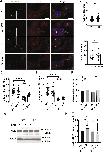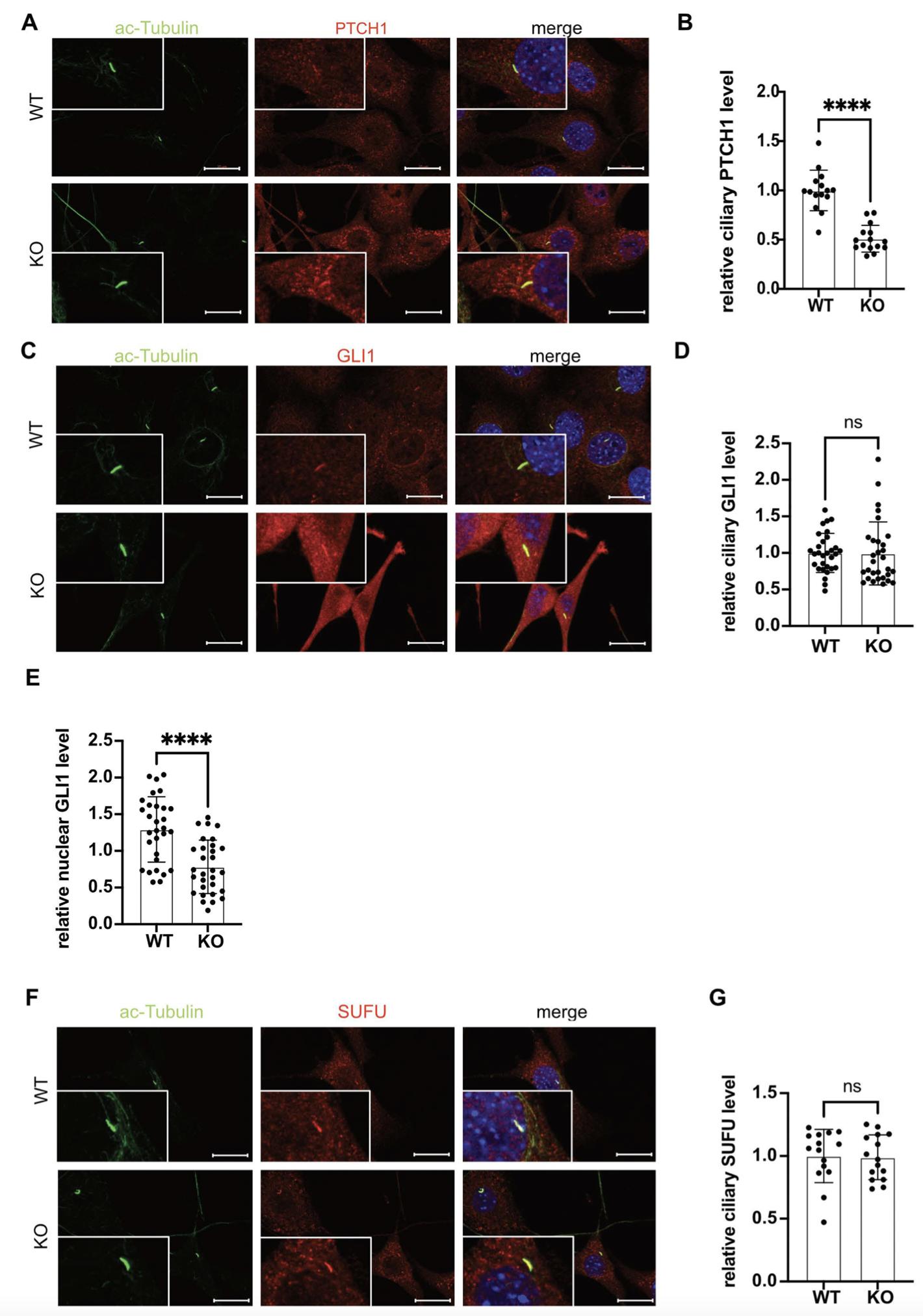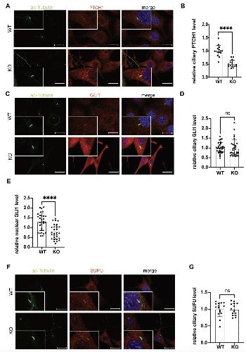 Fig. S2. Reduction of GID-complex function results in aberrant protein homeostasis in primary cilia. (A) Representative microscope images of PTCH1 localization. Cells were treated with cilia-inducing medium (high-glucose DMEM with 0.5% serum) for 24 h and fixed. Axonemes were stained with anti-acetylated TUBA4A (ac-tubulin) antibody (green); anti- PTCH1 antibody (red) was used to visualize PTCH1 protein and DAPI (blue) to stain DNA. Images of respective cells were merged (merge). Scale bars, 20μm. (B) Relative PTCH1 protein level per axoneme. PTCH1 fluorescence intensity (red) was measured in the area demarcating the axoneme (green) in WT and KO cells and normalized with the level of acetylated- tubulin, average WT was set to 1. Y-axes show relative ciliary PTCH1 level. Unpaired t-test n = 15 (WT), n = 15 (KO). ****, P < 0.0001. (C) Representative microscope images of GLI1 localization. Cells were treated with cilia-inducing medium (high-glucose DMEM with 0.5% serum) for 24 h and fixed. Axonemes were stained with anti-acetylated TUBA4A (ac-tubulin) antibody (green); anti-GLI1 antibody (red) was used to visualize GLI1 protein and DAPI (blue) to stain DNA. Images of respective cells were merged (merge). Scale bars, 20μm. (D) Relative GLI1 protein level per axoneme. GLI1 fluorescence intensity (red) was measured in the area demarcating the axoneme (green) in WT and KO cells and normalized with the level of acetylated-tubulin, average WT was set to 1. Y-axes show relative ciliary GLI1 level. Unpaired t-test n = 30 (WT), n = 30 (KO). ns, P > 0,05. (E) Relative nuclear GLI1. GLI1 fluorescence intensity (red) was measured in the area demarcating the nucleus (blue) in WT and KO cells and normalized with the signal intensity of DAPI, average WT was set to 1. Y-axes show relative nuclear GLI1 level. Unpaired t-test n = 30 (WT), n = 30 (KO). ns, P < 0,0001. (F) Representative microscope images of SUFU localization. Cells were treated with cilia-inducing medium (high-glucose DMEM with 0.5% serum) for 24 h and fixed. Axonemes were stained with anti- acetylated TUBA4A (ac-tubulin) antibody (green); anti-SUFU antibody (red) was used to visualize SUFU protein and DAPI (blue) to stain DNA. Images of respective cells were merged (merge). Scale bars, 20μm. (G) Relative SUFU level in cilia. SUFU fluorescence intensity (red) was measured in the area demarcating the nucleus (blue) in WT and KO cells and normalized with the signal intensity of acetylated-tubulin, average WT was set to 1. Y-axes show relative ciliary SUFU level. Unpaired t-test n = 15 (WT), n = 15 (KO). ns, P >0,05. |