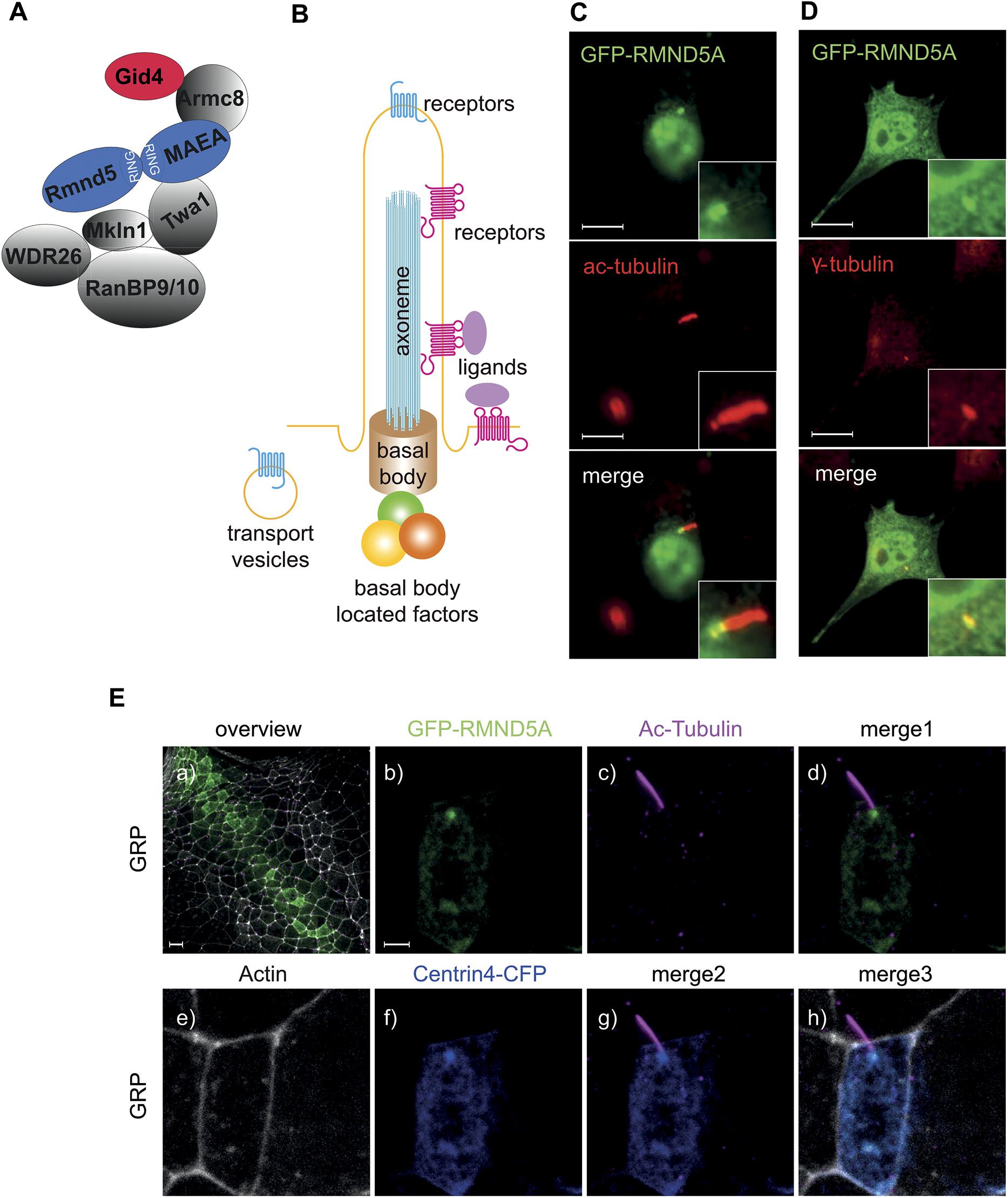 Fig. 1. GID subunits colocalize to the basal body of mono-ciliated cells. (A) Schematic model of the vertebrate GID complex and its known subunits; RING domain-containing subunits are highlighted in blue, the substrate-recruiting factor GID4 is highlighted in red. (B) Schematic model of the primary cilium, composed of a basal body, axoneme and ciliary membrane. A large number of transporters, structural proteins, membrane receptors and basal body-located factors function in the primary cilium. (C,D) RMND5A localizes to the basal body of the primary cilium in NIH-3T3 cells. Cells were transfected with plasmids encoding GFPâRMND5A for 24 h and then further serum-starved (high glucose DMEM, 0.5% FCS) for an additional 24 h to induce ciliogenesis. After fixation, cells were stained for (C) acetylated tubulin (ac-tubulin) or (D) γ-tubulin to visualize the axoneme or the basal body of the primary cilium, respectively. Images were merged to identify overlapping signals (merge, yellow). Inset images show the magnification of a primary cilium and the basal body. Images shown in C and D are representative of seven and four images, respectively. Scale bars: 10 μm. (E) Rmnd5a localizes to basal bodies of motile mono-cilia of the GRP in X. laevis. mRNAs encoding GFPâRmnd5a (green) and Centrin4âCFP (blue, centrioles/basal bodies) were injected at the four-cell stage. Embryos were fixed and stained at NF stage 17 to visualize cilia (magenta, ac-tubulin) and actin (white). Merge 1 shows a merged image of Eb and Ec; merge 2 shows a merged image of Ec and Ef; and merge 3 shows a merged image of Ee, Ef and Ec. Images are z-projections of confocal micrographs and represent five biological samples derived from one experiment. Scale bars: 20 μm (Ea), 3 μm (Ebâh). |