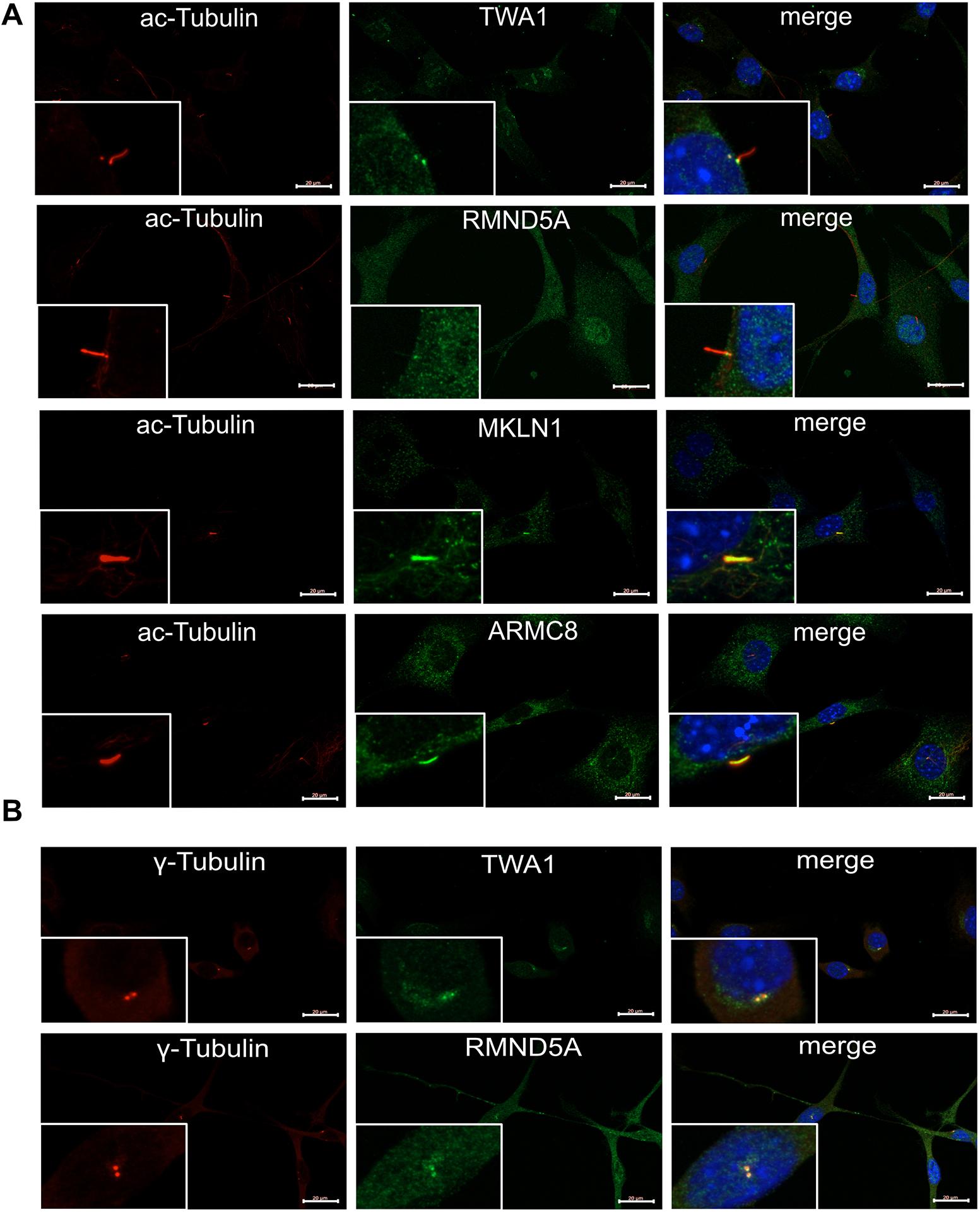 Fig. 2. GID complex subunits colocalize with primary cilia and centrioles. (A) Cells were serum- starved (high glucose DMEM, 0.5% FCS) for 24 h to induce ciliogenesis. After fixation, cells were stained for acetylated tubulin (ac-tubulin) to visualize the axoneme of the primary cilium. Additional antibodies were diluted 1:100 in PBS containing 3% BSA and 0.3% Tween-20 and used to visualize subunits of the GID complex (TWA1, RMND5A, MKLN1 and ARMC8). Nuclei were stained using DAPI (blue). (B) As described in A without prior serum starvation and stained for γ-tubulin to visualize the basal body of the primary cilium. Images in A and B were merged to identify overlapping signals (merge, yellow). Inset images show a cell with a primary cilium at original size at the respective magnifications. Scale bars: 20 μm. Percentage of cells with ac- Tubulin colocalization: TWA1, 75.9%, n=29; RMND5A, 60.7%, n=28; ARMC8, 96.3%, n=27; MKLN1, 93.1%, n=29. Percentage of cells with γ-tubulin colocalization: TWA1, 87.1%, n=31; RMND5A, 82.8%, n=29; n=total number of cells investigated. |