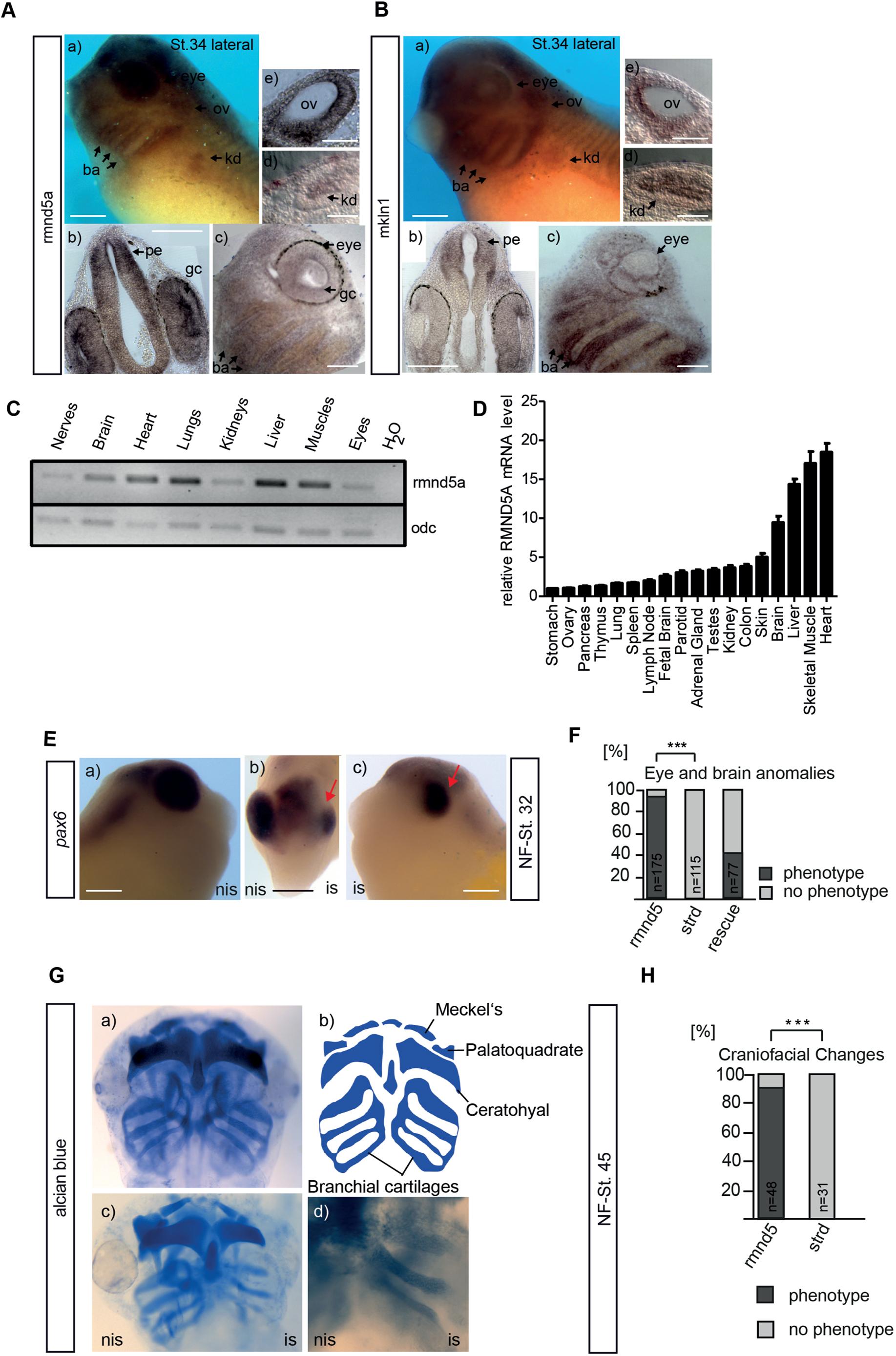 Fig. 6. GID genes are expressed in ciliated organs during X. laevis development. Spatial analysis of expression of GID complex subunits rmnd5a (A) and mkln1 (B) in X. laevis. WMISH of WT X. laevis embryos at developmental stage 34 (St. 34; lateral views in Aa and Ba) and the corresponding transverse (b,e,d) and sagittal (c) sections (ov, otic vesicle; pe, prosencephalon; ba, branchial arches; kd, pronephric kidney; gc, ganglion cells). Images are representative of three experiments. Images in Ab and Bb are the result of tiling multiple fields of view. Scale bars: 300 μm in Aaâc and Baâc; 100 μm in Ad, Ae, Bd and Be. (C) RT-PCR analysis of rmnd5a expression in distinct tissues of X. laevis. RT-PCR of odc1 (odc) is shown as an RNA input control (bottom). Data are representative of three experiments. (D) Quantification of relative mRNA levels of human RMND5A in various tissues. cDNA was reverse transcribed from the indicated RNA samples. β-actin (ACTB) levels were used as the qPCR internal control. RMND5A mRNA of different tissues is compared to its corresponding housekeeping gene (ACTB) in percent. In most tissues, RMND5A is expressed in an amount equivalent to more than 5% of the housekeeping gene. Mean±s.e.m., n=3. (EâH) Rmnd5a alteration is associated with ciliopathy-like phenotypes. (E) rmnd5a-mo-injected embryos (NF-St. 32, NF stage 32; is, injected side; nis, non-injected side) were used for in situ hybridization with the pax6 marker. The red arrow in images b and c indicates the eye of the injected side of the morpholinos. Scale bars: 300 μm. (F) Quantitative representation of rmnd5a-mo (rmnd5), negative control standard-mo (strd) and rescue (co-injection with rmnd5a-mo and synthetic Rmnd5a-encoding RNA) phenotypes, presented as a bar graph (embryos with phenotype as a percentage of the total number of embryos scored; black, phenotype; gray, no phenotype). n=number of injected embryos analyzed for the respective marker. ***Pâ¤0.001 (chi-square test). (G) Analysis of the formation of head cartilage by Alcian Blue cartilage staining in swimming tadpoles at NF stage 45 (NF-St. 45). Meckelâs cartilage, ceratohyal cartilage, branchial cartilage and basihyal cartilage is shown in control standard- mo-injected (a) and rmnd5a-mo-injected (c,d) tadpoles (is, injected side; nis, non-injected side). A schematic of WT cartilage formation is shown in image b. (H) Quantitative representation of craniofacial changes in rmnd5a-mo-injected and standard-mo-injected tadpoles, with phenotypes displayed as a bar graph (embryos with a phenotype as a percentage of the total number scored; black, phenotype; gray, no phenotype). n=number of injected embryos analyzed. ***Pâ¤0.001 (chi-square test). |