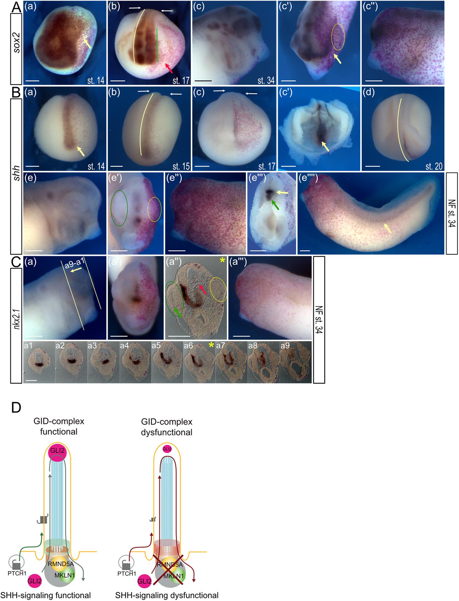 Fig. 7. Suppression of rmnd5a function interferes with neural patterning. (AâC) Embryos injected with rmnd5a-mo were used for in situ hybridization with (A) sox2 ( pan-neural marker), (B) shh (axial mesoderm and SHH target gene in the floor plate) and (C) nkx2.1 (marker of the ventral forebrain) at the indicated NF stages (st.; st. 14 in Aa, Ba; st. 15 in Bb; st. 17 in Ab, Bc, Bcâ²; st. 20 in Bd; st. 34 in AcâAcâ²â², BeâBeâ²â²â²â² and C). Injected sides are shown on the right of the images (red color) and in Acâ²â², Aeâ²â², Aeâ²â²â²â² and Caâ²â²â², non-injected sides are shown on the left of the images and in Ac, Ae and Ca. Images show anterior views (Aa, Ab, Acâ², Ba-Bc, Beâ², Beâ²â²â², Cb), lateral views (Ac, Acâ²â², Be, Beâ²â², Beâ²â²â²â², Ca, Caâ²â²â²) or superior views (Bd). Expression of sox2 at NF stage 14 is shown in image Aa (anterior view; n=29/ 31); the yellow arrow indicates less patterned sox2 expression. The white arrows in images Ab, Bb and Bc indicate delayed development of the neural tube and smaller hemisphere. Yellow dashed lines in images Ab, Bb and Bd highlight sickle-shaped curvature towards the injected side. Green dashed line in image Ab indicates less patterned sox2 expression of the injected side within the presumptive brain region. Red arrow in image Ab indicates alleviated formation of the eye vesicle. Yellow arrow in image Acâ² marks the shifted olfactory anlage, and the oval indicates the remnant of the larval eye (visible in Acâcâ²â²). (B) Suppression of rmnd5a function results in almost normal shh expression domains. Yellow arrows indicate the prechordal plate; image Bcâ² shows an inner view of an opened larva at NF stage 17. Yellow dashed line in image Bd indicates bending of the larva. Reduction of forebrain and eye development can be seen upon Rmnd5a- knockdown (yellow dashed oval) compared to the non-injected side (green dashed oval) in image Beâ². Green arrow in Beâ²â²â² shows primary expression of shh in the notochord; yellow arrow in Beâ²â²â² and Beâ²â²â²â² shows secondary domain of shh expression in the floor plate of the neural tube. (C) Expression of nkx2.1 in NF stage 34 embryos (images a,aâ²,aâ²â²â²) and 20 μm vibratome sections (Ca1âa9, positions as indicated in image Ca; frontal plane shown in image Caâ²â²). In image Caâ²â², the green arrow indicates the prospective lens on the non-injected side, the red arrow indicates a reduction of nkx2.1 expression on the injected side, the green oval indicates the prospective eye on the non-injected side, and the yellow oval indicates the prospective eye on the injected side. Asterisk indicates frontal section of the anterior head shown in Caâ²â² and Ca6. Ca and Caâ²â²â² show lateral views of the non-injected side and injected side of the embryo, respectively. Scale bars: 300 μm. (D) Model of the primary cilium and a proposed function of the cilia-localized GID complex in the regulation of SHH protein homeostasis in the cilium. Left: primary cilium with a functional cilia-localized GID complex and functional SHH signaling response. Protein homeostasis of SHH components in the cilium is maintained (green). Right: primary cilium with aberrant protein homeostasis, reduction of SHH signaling components â namely GLI2 and PTCH1 â in the cilium and dysfunctional SHH signaling response without a functional GID complex (red). |