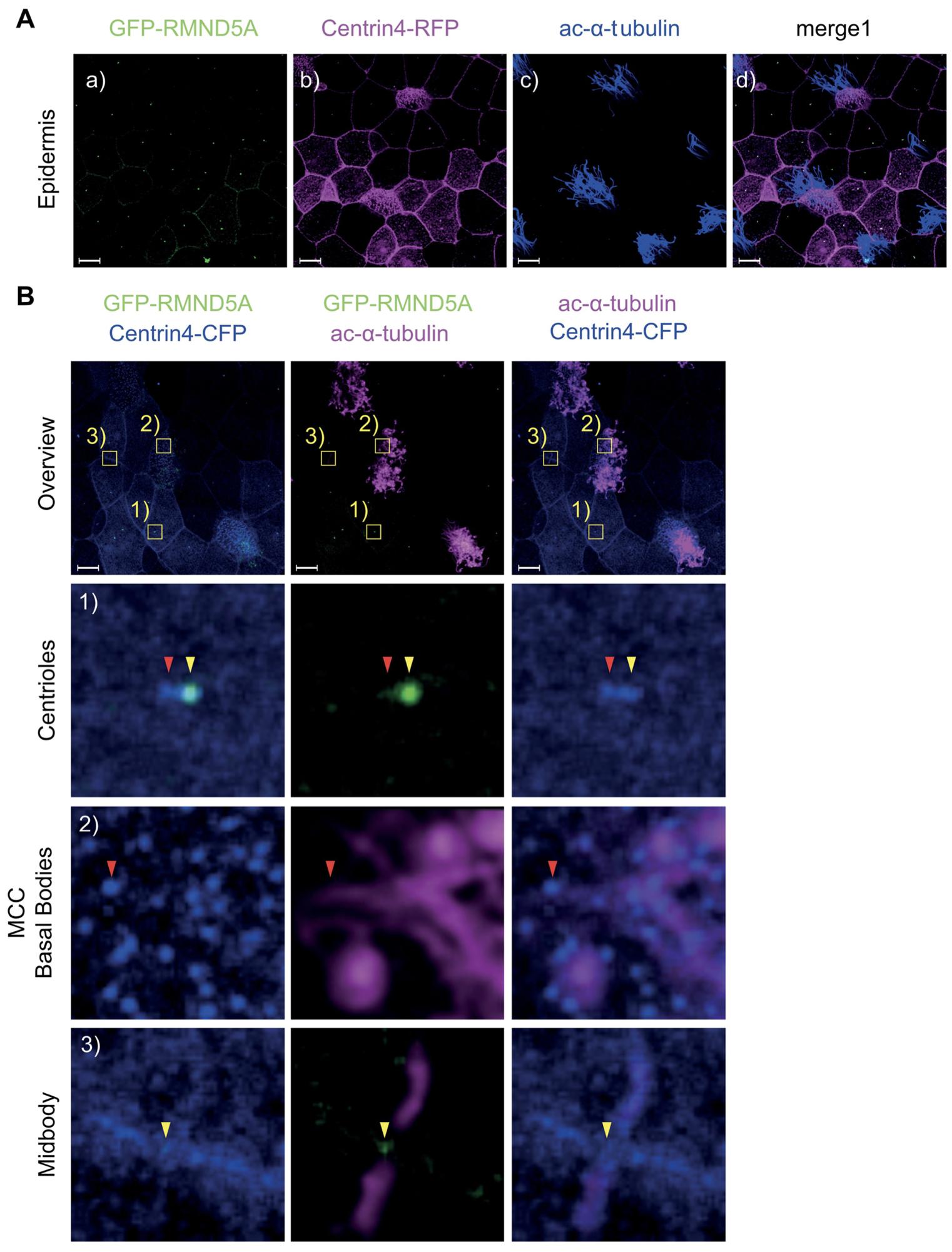 Fig. S1. Localization of Rmnd5a in the Xenopus laevis epidermis. Embryos were single or double injected with mRNAs (240pg~800pg per injection) at the 4-cell stage encoding (A) a) GFP-Rmnd5a (green), b) Centrin4-RFP (magenta), c) and Ac-α-tubulin (blue), d) merge; (B) (overview, left panel, GFP- Rmnd5a (green) and Centrin4-CFP (blue); middle panel, GFP-Rmnd5a and Ac-α-tubulin (magenta); right panel, Ac-α-tubulin (magenta) and Centrin4-CFP (blue)). In the yellow boxes (B), zoom sections of distinct areas of Xenopus laevis epidermis: 1) Centrioles, 2) MCC basal bodies, 3) midbody are represented. Immunofluorescence was performed on embryos fixed at embryonic stage 17 in 4% paraformaldehyde at 4°C overnight. Imaging was performed on a Zeiss LSM 700 confocal microscope. (Scale bar in A=10μm, B overview= 10μm, D. b-h=3μm). |
