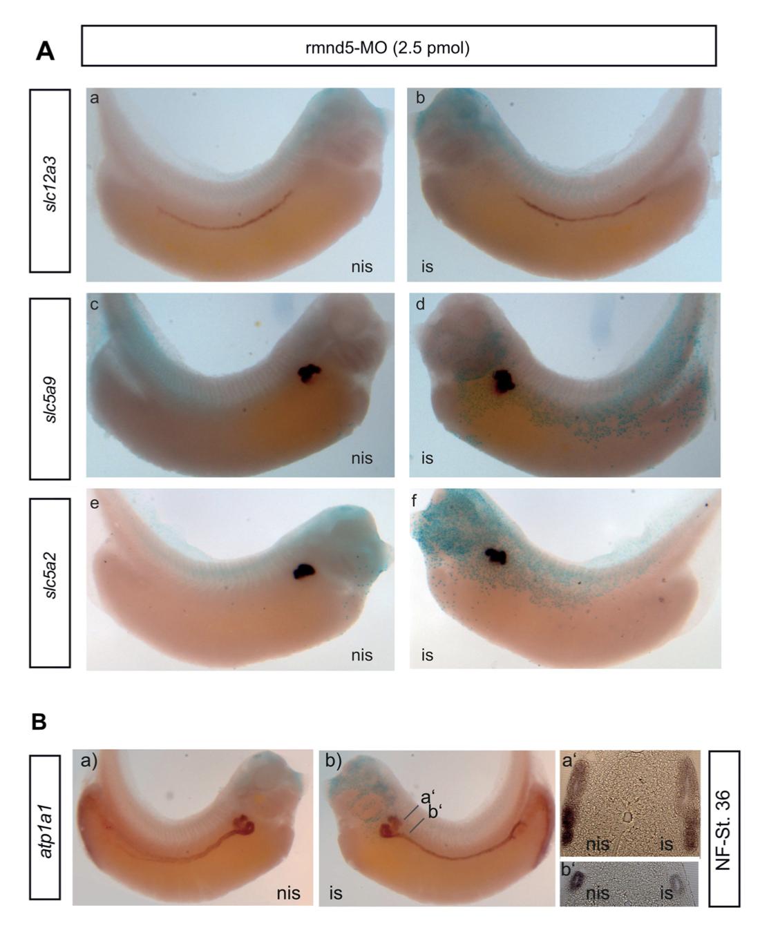 Fig. S3. Suppression of RMND5A function is not associated with defects in the segmentation of pronephric kidney during development. (A) rmnd5a- morpholino (2.5 pmol/embryo) injected embryos (NF st.36) were subjected to in situ hybridization with indicated marker probes; slc12a3 (a, b) and slc5a9 (c, d), and slc5a2 (e, f). (B) rmnd5a-morpholinos injected embryos were used for in situ hybridizations (WMISH) (NF36) with indicated marker atp1a1. aâ and bâ show zoom sections of embryos kidneys. Abbreviations: is, injected side; nis, non-injected side. |