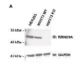 Fig. S4. Illustration of anti-RMND5A antibody specificity. Western blot analysis on NIH 3T3 cells. GAPDH serves as loading control. The anti-RMND5A antibody detects Rmnd5a in WT NIH 3T3 cells at its predicted molecular weight of 44 kDa. In contrast, the antibody does not provide a signal in NIH 3T3 cells lacking Rmnd5a. |