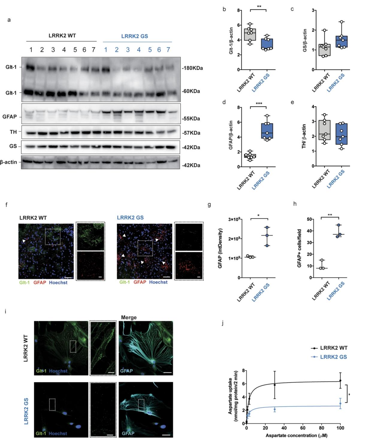 Fig. 2. Glutamate transporter is downregulated in the striatum of LRRK2 G2019S mice. a Western blot analysis of LRRK2 WT and LRRK2 G2019S striatal lysates using anti-Glt-1, anti-GS, anti-GFAP, and anti-TH antibodies; be relative quantification of band intensity was performed using ImageJ and normalized to -actin (n=7 striatal samples for both LRRK2 WT and LRRK2 G2019S 4-month-old mice); f representative confocal double-labeling images for Glt-1 (green) and GFAP (red) in LRRK2 WT and G2019S striatal slices; scale bar 50 m, insets 20 m; g quantification of GFAP IntDen and GFAP+ cells (h) in the dorsal striatum of LRRK2 WT and G2019S mice. Three different fields per animal were collected, n=3 animals for each genotype; i representative confocal images of the cellular distribution of the endogenous Glt-1 (green) in primary striatal astrocytes stained for GFAP (cyan) derived from LRRK2 WT and LRRK2 G2019S mice treated with dbcAMP (500 M) for 10 days; scale bars 20 m, inserts 5 m; j striatal gliosomes from LRRK2 WT and LRRK2 G2019S 4-month-old mice were exposed for 2 min at 37 C to increasing concentration of [3H]D-Asp (0.03, 0.1, 1, 3, 30, and 100 M) in the presence of 10 M UCPH to exclude [3H]D-Asp uptake by Glast. The specific [3H]D-Asp uptake is expressed as nmol/mg protein/2 min; the kinetic parameters Vmax and Km were obtained by fitting data with the MichaelisMenten equation (n=4 independent experiments for each group). Statistical analysis in (b, e, h, and j) was performed using unpaired T test; statistical analysis in g was performed using MannWhitney test. |