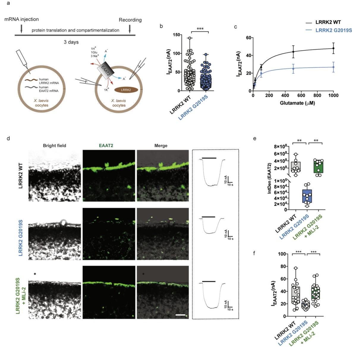 Fig. 3. LRRK2 G2019S alters EAAT2 electrophysiological properties. a Schematic outline of the experimental setup. Oocytes were co-injected with mRNA of EAAT2 and human LRRK2 (WT or G2019S) and glutamate transport-associated currents were recorded using the two-electrode voltage-clamp technique; b the bar graph represents current amplitudes elicited in oocytes co-expressing EAAT2 and LRRK2 WT (n=79 oocytes, 12 frogs) or G2019S (n=122 oocytes, 12 frogs). Glutamate application was at 1 mM and the holding potential at60 mV; c transport-associated currents in oocytes co-expressing EAAT2 and LRRK2 WT or G2019S as a function of glutamate concentration. The kinetic parameters Imax and aKm were obtained by fitting data with the MichaelisMenten equation (n=6 oocytes; 2 frogs); d representative bright-field (left column) or fluorescence (middle column, merge on the right column) images of oocyte slices co-expressing EAAT2 (green) and LRRK2 WT or G2019S, with or without 90 min MLi-2 (200 nM) treatment; scale bar 20 m. Representative traces of the recorded transport current in all the three groups are shown on the right; e quantitative analysis of the IntDen of the EAAT2 signal at the oocyte membrane was performed in three different fields for each oocyte; n=3 oocytes for each group; f the bar graph represents current amplitudes elicited in oocytes co-expressing EAAT2 and LRRK2 WT (n=18 oocytes, 6 frogs), G2019S (n=22 oocytes, 6 frogs), or G2019S+MLi-2 (n=22 oocytes, 6 frogs). Statistical analysis in b was performed using MannWhitney test, in e using one-way ANOVA test (F=8.891, P=0.001) followed by Tukeys multiple comparison test. Statistical analysis in (f) was performed using unpaired T test to compare EAAT2+LRRK2 WT to EAAT2+G2019S-injected oocytes and with paired T test to compare EAAT2+G2019S oocytes before and after LRRK2 inhibition. |