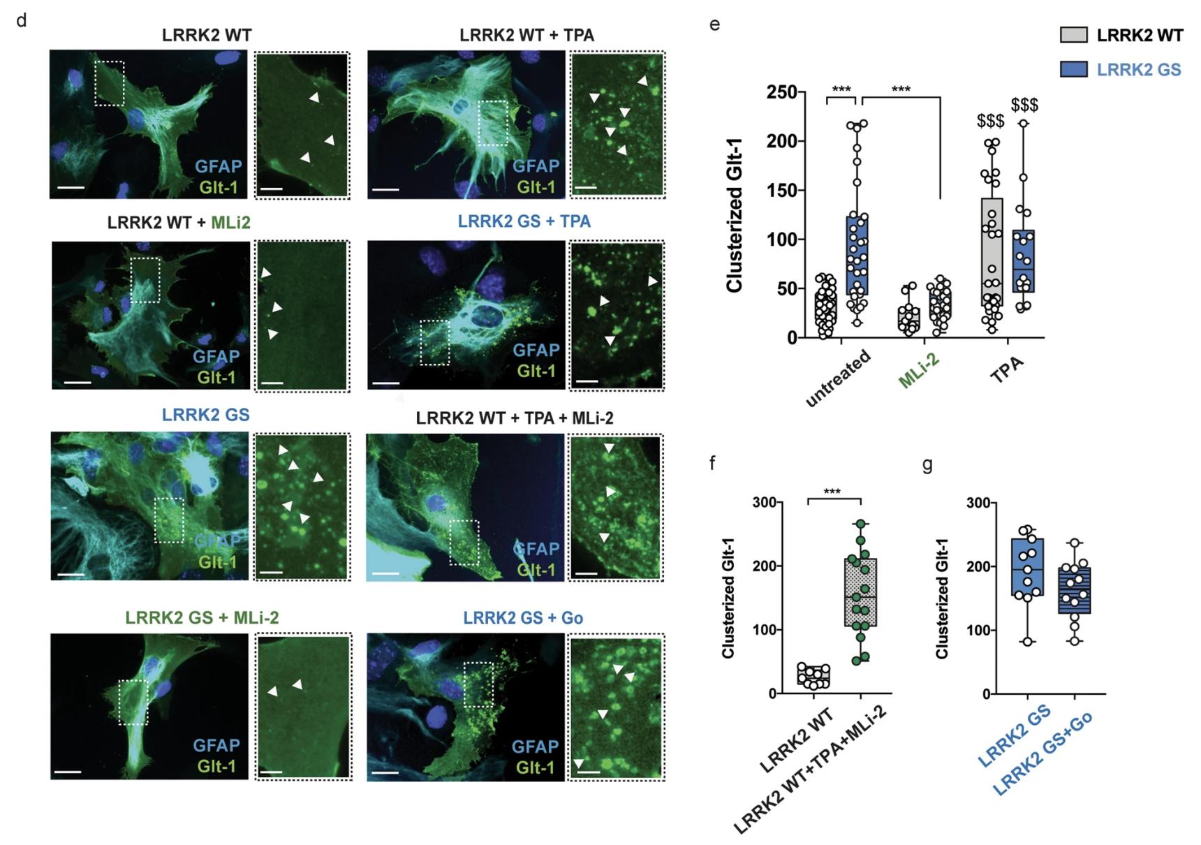 Fig. 4. [panels a,b,c] Astroglial Glt-1 is mislocalized in the presence of LRRK2 G2019S mutation. a Representative TIRFM images of Glt-1 localization in LRRK2 WT and LRRK2 G2019S astrocytes (untreated or treated with MLi-2) transfected with GFP-Glt1 (gray) and stained with GFAP (cyan). Scale bar 20 m; insets 10 m; b) quantification of the GFP-Glt-1 mean fluorescence performed in TIRFM images (n=25 cells from LRRK2 WT, n=16 cells from LRRK2 WT+MLi-2; n=30 cells from LRRK2 GS and n=31 cells from LRRK2 GS+MLi-2, experiments performed at least in triple); c schematic representation of TPA and Go 6976 effects on PKC activity; |