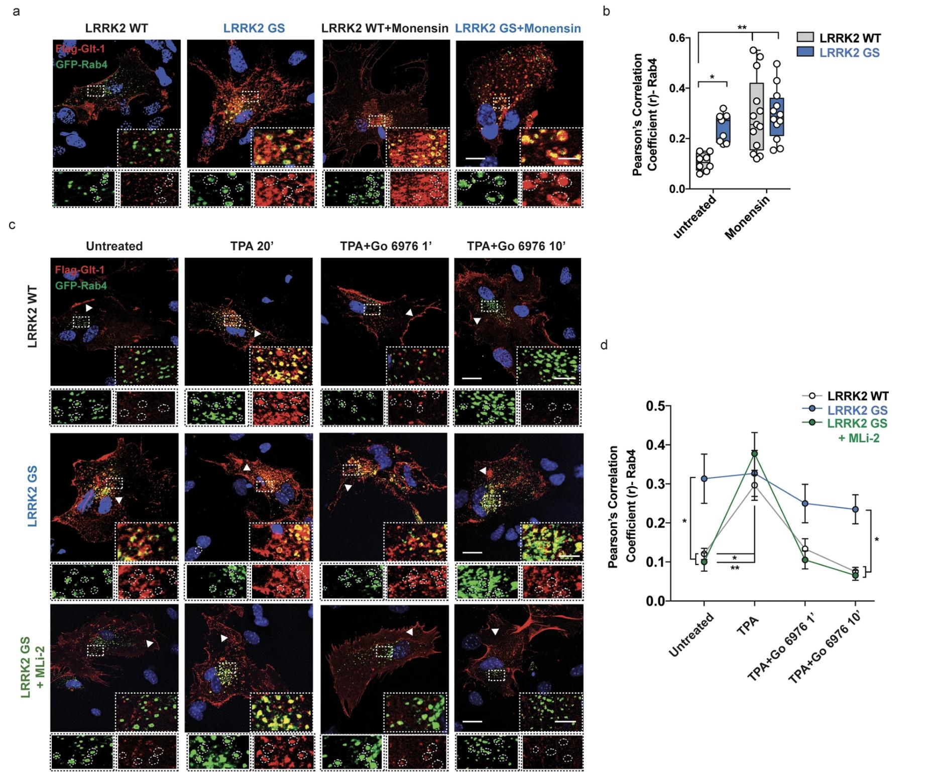 Fig. 7. [a-d] G2019S pathogenic LRRK2 mutation impacts on Glt-1 recycling and turnover. a Representative confocal images of primary striatal LRRK2 WT and G2019S astrocytes under basal conditions and treated with the recycling blocker Monensin (35 M, 40 min). Insets show the Rab4-positive area and the localization of Glt-1 in the indicated ROIs. Scale bars: 20 m; insets 5 m; b quantitative analysis of the Pearsons correlation coefficient of Glt-1 co-localizing with the Rab4-positive compartment; n=8 cells for LRRK2 WT, n=13 cells for LRRK2 WT+Monensin, n=9 cells for LRRK2 G2019S and n=12 cells for LRRK2 G2019S+Monensin, experiments performed at least in triple; c Representative z-stack confocal images of primary LRRK2 WT and G2019S (with or without MLi-2) striatal astrocytes transfected with Flag-Glt-1 (red) and GFP-Rab4 (green). The insets show Rab4-positive area and the localization of Glt-1 in these ROIs; scale bar 20 m; insets 5 m; d quantitative analysis of the Pearsons correlation coefficient of Glt-1 co-localizing with the Rab4-positive compartment in the four selected experimental time points. At least n=6 cells have been analyzed for each experimental group and the experiments have been performed in triple; |
