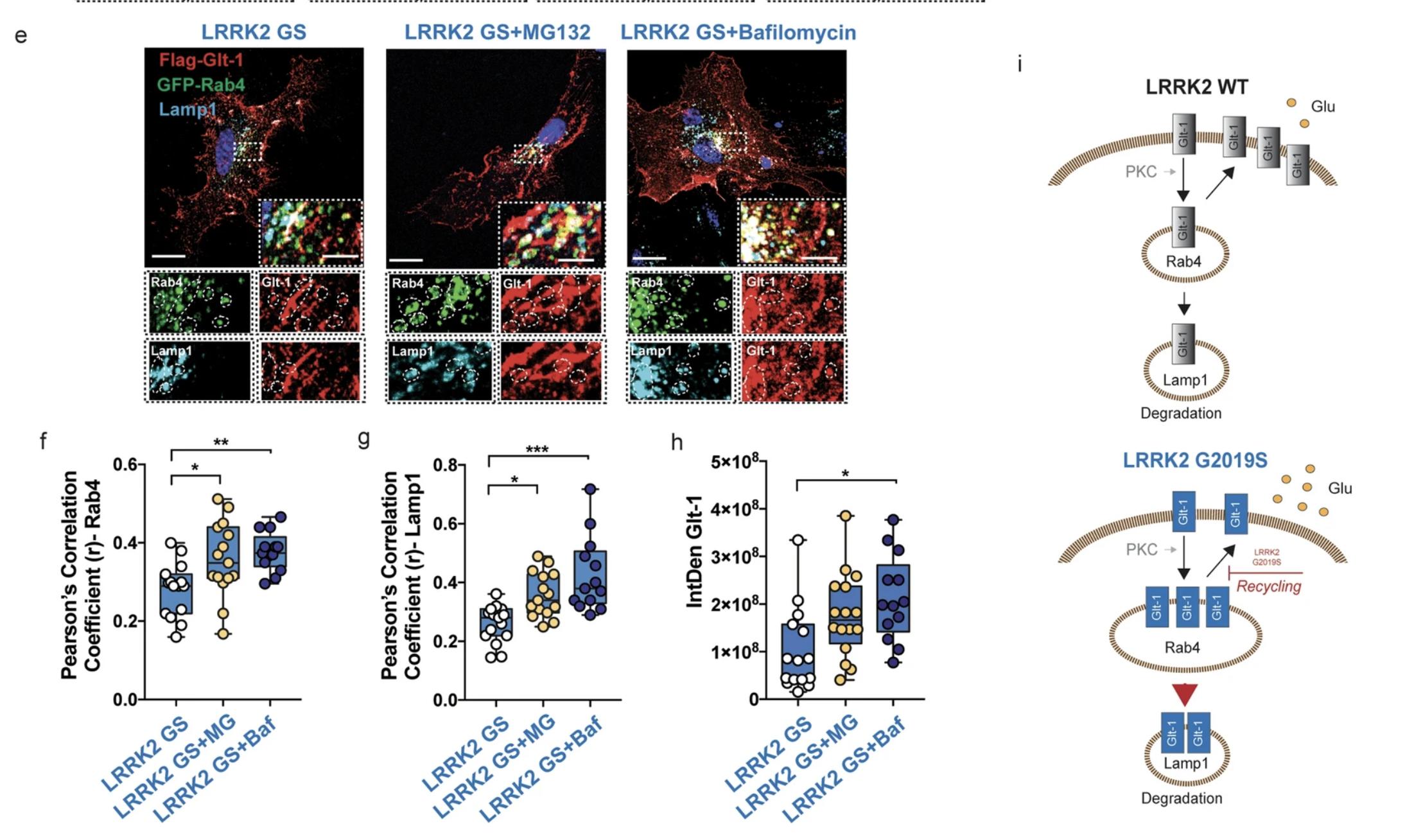 Fig. 7. [e-i] G2019S pathogenic LRRK2 mutation impacts on Glt-1 recycling and turnover. e representative z-stack confocal images of primary striatal LRRK2 G2019S astrocytes transfected with GFP-Rab4 and Flag-Glt-1 (red) and labeled for endogenous Lamp1 (far red, pseudocolored in blue). Insets show Rab4- and Lamp1-positive area and the localization of Glt-1 in these ROIs. Scale bar 20 m; insets 5 m; f Quantitative analysis of the Pearsons correlation coefficient of Glt-1 co-localizing with the Rab4-positive vesicles in LRRK2 G2019S astrocytes under basal conditions (n=15 cells) or upon MG132 (n=15 cells) or Bafilomycin application (n=13 cells); g quantitative analysis of the Pearsons Correlation Coefficient of Glt-1 co-localizing with the Lamp1-positive structures in LRRK2 G2019S astrocytes under basal conditions (n=15 cells) or upon MG132 (n=15 cells) or Bafilomycin (n=13 cells) application; experiments performed at least in triple; h Quantitative analysis of Glt-1 IntDen in LRRK2 G2019S astrocytes, under basal condition or after application of MG132 or Bafilomycin A1 (n=15 cells for untreated LRRK2 GS, n=16 cells for LRRK2 GS+MG132 and n=13 LRRK2 GS+Bafilomycin; experiments performed at least in triple); i schematic representation of Glt-1 trafficking in LRRK2 WT and LRRK2 G2019S astrocytes. Statistical analysis in b was performed using two-way ANOVA test (treatment: F=12.86 and p=0.0009; Genotypes F=4.672 and p=0.03) followed by Tukeys multiple comparisons test; statistical analysis in d was performed using two-way ANOVA test (treatment: F=16.17 and p<0.0001; group: F=13.87 and p<0.0001) followed by Tukeys multiple comparison test; statistical analysis in (fh) was performed using one-way ANOVA test (f F=6.68 and p=0.003); g F=12.07 and p<0.0001; h F=5.79 and p=0.006) followed by Tukeys multiple comparisons test (*LRRK2 WT vs LRRK2 G2019S, #LRRK2 G2019S vs LRRK2 G2019S+MLi-2) |