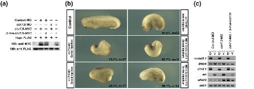 (n = 57). Ventral gastrulation defects, 89.6% (n = 58). Dorsal gastrulation defects, 85.7% (n = 49). Ventral gastrulation defects, 86.7% (n = 53). (c) RT-PCR analysis of the dorsal or ventral sectors of embryos injected with MO and the indicated mRNA(s) at the gastrula stage.
