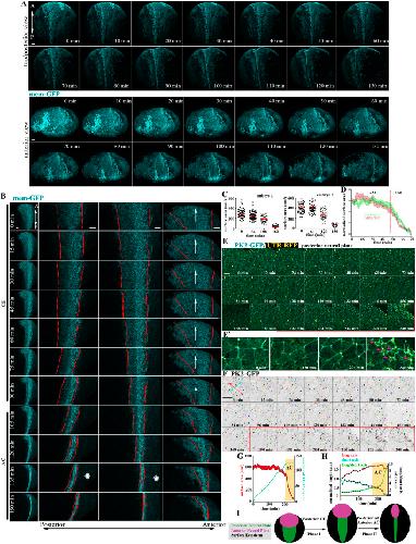 Fig. 4. AC is initiated subsequent to CE and is the major contributor of NTC the anterior region. (A) Stills from a 3D-rendered, time-lapse recording of a neurula-stage embryo. Scale bars: 100 µm. (B) Stills from a time-lapse recording of a second neurula-stage embryo. In the left column, the entire embryo is shown. The next three columns show zoomed NP areas (posterior to anterior, from left to right). CE at the posterior NP precedes AC and is concomitant with the forward displacement (arrow) of the anterior region. Posterior NTC is completed before anterior NTC (asterisks). Scale bars: 100 µm. (C) Quantification of neuroepithelial cell apical cell-surface area of two different embryos. Data are mean±s.e.m.; n=50 cells for all time points except the last time point of embryo 2, which is 35 cells. (D) Quantification of apical cell-surface area of posterior and anterior NP cells shows that AC (rapid reduction of apical surface area) occurs simultaneously at the posterior and anterior NP. n=30 posterior and 30 anterior NP cells. (E) Stills from a time-lapse recording from the posterior region of a neurula-stage embryo. Imaging was initiated at stage 12.5. Red box indicates the period during which AC takes place. Scale bar: 50 µm. (E′) Zoomed images of selected time points from E. Arrowheads indicate the appearance of apical-medial actomyosin during AC. (F) Cell tracking of magnified regions of the images shown in E. Neighbour exchanges (red and yellow cells are an example) only take place before AC initiation (red box). Double-headed arrows were used for the quantification shown in H: red indicates the length of the cell collective at the A/P direction, cyan indicates the length of the cell collective at the ML direction. Scale bar: 50 µm. (G) Quantification of apical cell surface area and T1-T3 transitions over time. Initiation of AC is marked by the yellow box. The coloured area in the graph for the cell surface area represents s.e.m.; n=30 cells for each time point. (H) Quantification of A/P length of cell collective (long axis; red line), ML length of cell collective (short axis; cyan) and the ratio of A/P and ML (long/short axis; green line). A/P length increases through CE until the initiation of AC when it is slightly reduced, indicating the absence of cell intercalative behaviour. The A/P length is dramatically reduced during AC, when the tissue begins to bend towards the midline. (I) Schematic showing the contribution of AC and CE to changes in morphology during NTC. A, anterior; a.u., arbitrary units; P, posterior. |