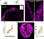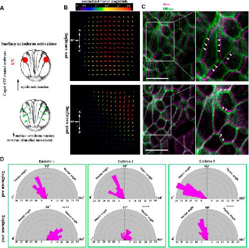 Figure 8. Increased SE contractility negatively impacts NTC. (A) Schematic showing the experimental approach to increase tissue tension within the SE through optogenetic uncaging of ATP. (B) PIV analysis illustrating reversed movement of SE upon ATP uncaging within the SE. A, anterior; P, posterior. (C) Time colour-coded representative images of the SE before and after SE-targeted ATP uncaging. Boxed areas are shown at higher magnification to the right. Arrowheads indicate the direction of cell displacement. Scale bars: 50â μm. (D) Quantification of SE movement vector angle presented as a rose diagram showing the percentage of angles values between 0 and 180°. 0° represents movement parallel with the ML embryo axis and 90° represents movement parallel with the embryo A/P axis. ****P<0.0001 (KolmogorovâSmirnov test). n=60 vector angles for embryo 1; 120 vector angles for embryo 2; and 400 vector angles for embryo 3. A, anterior; P, posterior. |