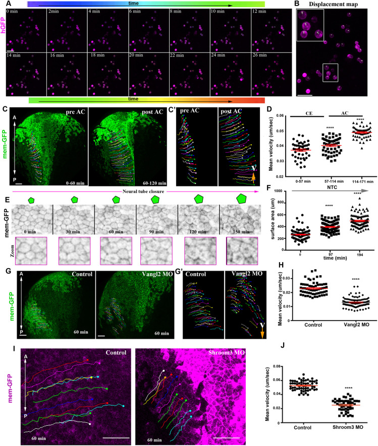Figure 5. SE medial movement requires forces generated by NP morphogenesis. (A) Stills from a time-lapse recording of deep SE cells plated on an FN-coated coverslip. Tracks (spots) are time colour-coded. (B) Displacement map from a 26â min time window from the time-lapse recording used for cell tracking in A, indicating absence of cell movement. Boxed area is shown at higher magnification in inset. (C) Stills from a tracked time-lapse recording of a control embryo before (left) and after (right) AC. (Câ²) Zoomed tracks from the recording shown C showing the increase of cell displacement and velocity (V) during AC. (D) Quantification of the average cell velocity of SE cells during distinct phases of NTC. ****P<0.0001 (two-sided, unpaired Student's t-test); mean±s.e.m. n=46, 53 and 54 cells for the three different time periods. (E) Stills from a tracked time-lapse recording showing SE cells during NTC. As NTC progresses, the surface area of SE cells increases, as shown by the schematics above. (F) Quantification of the apical surface area of SE cells during NTC. ****P<0.0001 (two-sided, unpaired Student's t-test); mean±s.e.m. n=100 cells for each time point. (G) Stills from a tracked time-lapse recording of a control embryo (left) and a Vangl2 morphant embryo (right). (Gâ²) Zoomed tracks from the recording shown in C showing decrease of cell displacement and velocity (V) in the absence of CE in Vangl2 morphants. (H) Quantification of the average cell velocity from control and Vangl2 morphant embryos. ****P<0.0001 (two-sided, unpaired Student's t-test); mean±s.e.m., n=63 SE cells from a control and 97 SE cells from a Vangl2 morphant embryo. (I) Stills from a tracked time-lapse recording of a control embryo (left) and a Shroom3 morphant embryo (right). The displacement and velocity (V) of SE cells is decreased in the absence of AC. (J) Quantification of the average cell velocity from control and Shroom3 morphant embryos. ****P<0.0001 (two-sided, unpaired Student's t-test); mean±s.e.m., n=59 SE cells from a control and 49 SE cells from a Shroom3 morphant embryo. Scale bars: 100â µm. A, anterior; P, posterior. |
