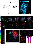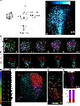 Figure 1. Live imaging reveals differential behaviour of posterior and anterior NP regions. (A) Schematic of the method used for the generation of 4D time-lapse recordings. (B) Representative temporal colour-coded maximum intensity projection of a time-lapse recording from an embryo expressing H2B-GFP (hGFP). (C) Stills from a single-cell-tracked time-lapse recording (Movie 1) of an embryo expressing H2B-GFP. (D) Stills from a tracked time-lapse recording revealing the behaviour of the posterior (spinal cord/hindbrain region) and anterior (midbrain/forebrain region) NP. The posterior NP narrows and elongates as time progresses, whereas the shape of the anterior NP remains the same. (E) Temporal colour-coded tracks shown in C displaying the evolution of anterior and posterior NP shape over time. (F) Displacement map of single-cell tracks overlaid over H2B-GFP signal at t0. The posterior NP cells move towards the midline. Anterior NP cells move anteriorly and ventrally. (G) ML motion direction colour-coded cell tracks revealing the absence of midline-directed movement from the anterior NP. (H) Generation colour-coded cell tracks. (I) Quantification of cell division at the posterior and anterior NP. Ï2 test shows no significantly statistical differences (ns) with respect to cell division events at the posterior and anterior NP. A, anterior; P, posterior. Scale bars: 100â µm. |