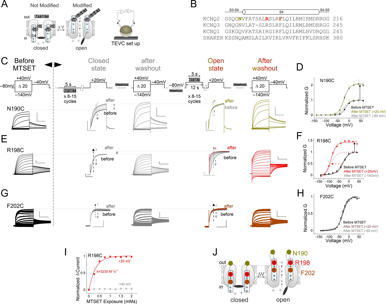 Figure 1. State-dependent modification of KCNQ2-R198C by external methanethiosulfonate (MTSET) is consistent with outward S4 motion. (A) Cartoons showing cysteine accessibility method with MTSET and two-electrode voltage clamp setup. (B) Sequence alignment of homologous S4 residues in KCNQ2, KCNQ3, KCNQ1, and Shaker channels. (C, E, and G) Currents from oocytes expressing (C) KCNQ2-N190C, (E) R198C, and (G) F202C channels in response to 20 mV voltage steps from â140 mV to +40 mV (left panels) before and after applications of MTSET (after washout, gray) in the closed and (after washout, color-coded) open states. MTSET is first applied (âclosed stateâ-middle panels) at â80 mV for 5 s in between 25 s washouts for 8â15 cycles and the change in current is measured at +20 mV. On the same cell and after MTSET is washed out of the bath, MTSET is reapplied (âopen stateâ-middle panels) at +20 mV using a similar protocol. We used 100 μM MTSET in (C) and (G), and 50 μM MTSET in (E). (D, F, and H) Steady-state conductance/voltage relationships, G(V)s, (lines from a Boltzmann fit) of (D) KCNQ2-N190C, (F) R198C, and (H) F202C channels normalized to peak conductance before MTSET application (black). The G(V) relationships after MTSET application in the closed (â80 mV, gray) and open (+20 mV, color-coded) states are obtained from recordings of panels (C), (E), and (G), (âclosed- and open stateâ-middle panels, respectively); mean ± SEM, n=3â24. (I) The rate of MTSET modification of R198C channels at +20 mV (red squares) or â80 mV (gray squares) was measured using the difference in current amplitudes taken at 400 ms after the start of the +20 mV voltage step, vertical dashed arrows in (E) between the first sweep (before MTSET application, which is represented by #0 along the vertical dashed arrows in (E) and normalized to zero) and the subsequent sweeps (after several MTSET application which are represented by #1, 2, â¦8â9 along the vertical dashed arrows in (E)) from the âclosed-state and open-stateâ-middle panels. The normalized delta current amplitude was plotted versus the cumulative MTSET exposure and fitted with an exponential. The fitted second-order rate constant in the open state protocol is shown in red. kopen = 3230 ± 3.8 Mâ1 sâ1 (n=8). (J) Cartoon representing the voltage-dependent cysteine accessibility data. MTSET modifies N190 in both the closed and open states. While F202 remains unmodified in both states (seemingly buried in the membrane), R198 becomes accessible only in the open state. Dashed line indicates the proposed outer lipid bilayer boundary. |