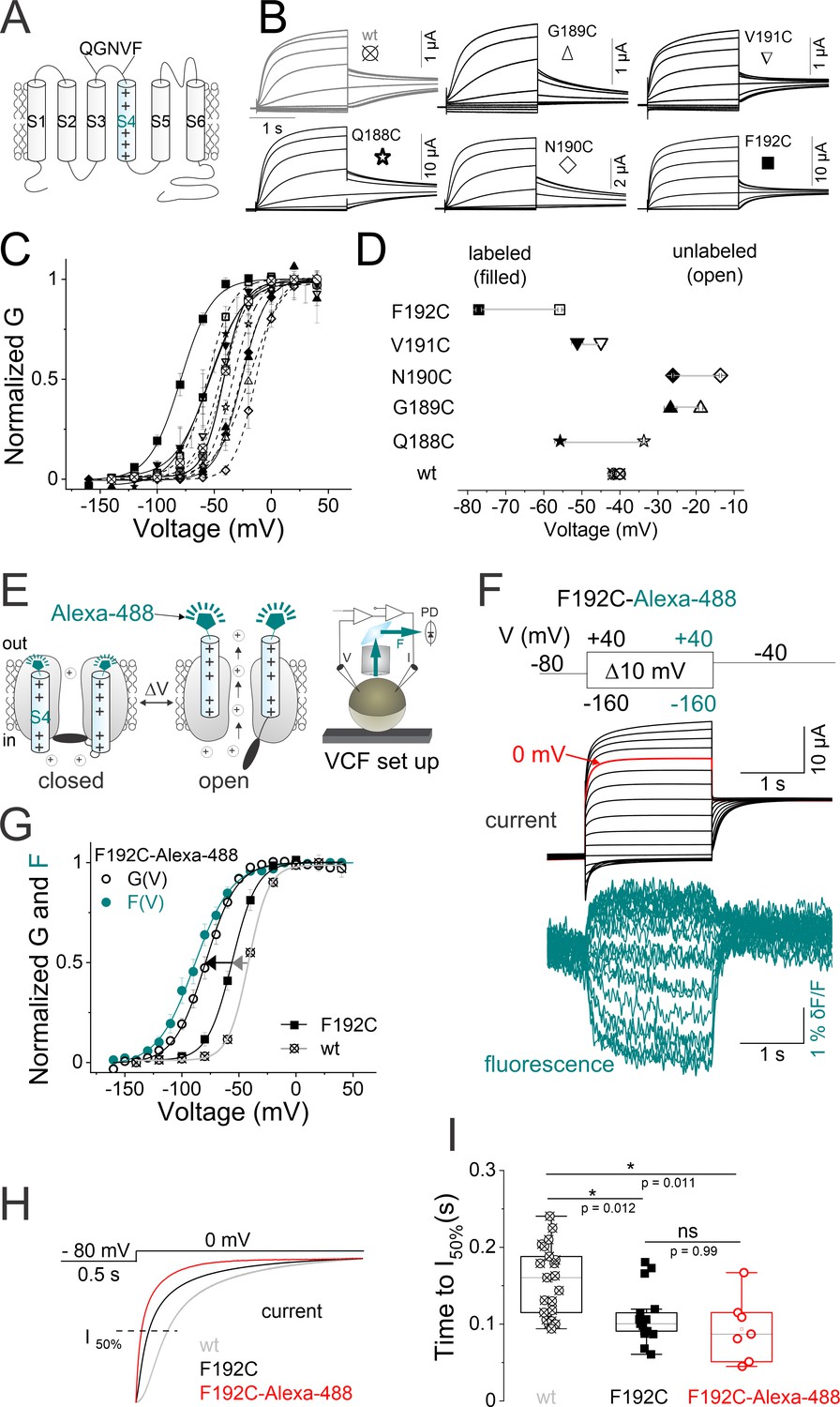 Figure 2. Labeled KCNQ2-F192C channels track S4 movement. (A) Cartoon showing the topology of one KCNQ2 subunit and the residues in the S3âS4 linker that were sequentially mutated to cysteine. (B) Currents from oocytes expressing a series of cysteine mutants in the S3âS4 linker of KCNQ2 channel. Cells are held at â80 mV and stepped to potentials between â140 mV and +40 mV in 20 mV steps for 2 s followed by a tail to â40 mV. (C) Normalized G(V) (lines from a Boltzmann fit) curves from (open symbols) unlabeled and (filled symbols) Alexa-488-maleimide labeled wt and cysteine mutations shown in (B). The midpoints of activation for the fits are shown in Supplementary file 1. Data are mean ± SEM, n=5â24; see Materials and methods. (D) Summary of G(V)1/2 values for the wt and cysteine mutants (open symbols) before and (filled symbols) after Alexa-488-maleimide labeling. (E) Cartoon representing the voltage clamp fluorometry (VCF) technique. A cysteine is introduced at position 192 (close to the voltage sensor [S4]) and labeled with a fluorophore tethered to a maleimide group (Alexa-488â5 maleimide). Upon voltage changes, labeled-S4s move and the environment around the tethered fluorophore changes, altering fluorescence intensity. Both current and fluorescence are recorded simultaneously using a VCF set up. (F) Representative current (black) and fluorescence (cyan) traces from Alexa-488-labeled KCNQ2-F192C channels (KCNQ2*) for the indicated voltage protocol (top). A sweep to 0 mV is depicted in red to facilitate comparison of time courses in (HâI). (G) Normalized G(V) (black solid lines from Boltzmann fit) and F(V) (cyan circles and cyan solid line from a Boltzmann fit) curves from (black circles) F192C-Alexa-488 âKCNQ2*â, (black squares) unlabeled F192C, and (gray squares) wt channels. The midpoints of activation for the fits are: GV1/2F192C-Alexa-488 = â77.1 ± 2.7 mV, (n=9), FV1/2F192C-Alexa-488 = â87.1 ± 3.9 mV, (n=8), GV1/2 unlabeled-F192C = â55.8 ± 0.8 mV, (n=9), and GV1/2wt = â43 ± 0.7 mV, (n=21), Supplementary file 1. Data are mean ± SEM; see Materials and methods. (H) Representative current time courses of (gray) wt, (black) F192C, and (red) F192C-Alexa-488 channels in response to the protocol shown on top. The dashed line represents 50% of the maximum current level at the end of the depolarizing pulse. (I) The time courses of current activations are quantified as the time to reach half the maximum current level at the end of the depolarizing pulse in (H, dashed line). Data are presented as mean ± SEM, n=9â21. Statistical significance was determined using ANOVA and Tukeyâs post hoc test, and significance level was set at p<0.05. Asterisks denote significance: p<0.05*. V: voltage; PD in this cartoon represents: photodiode photodetector. |