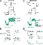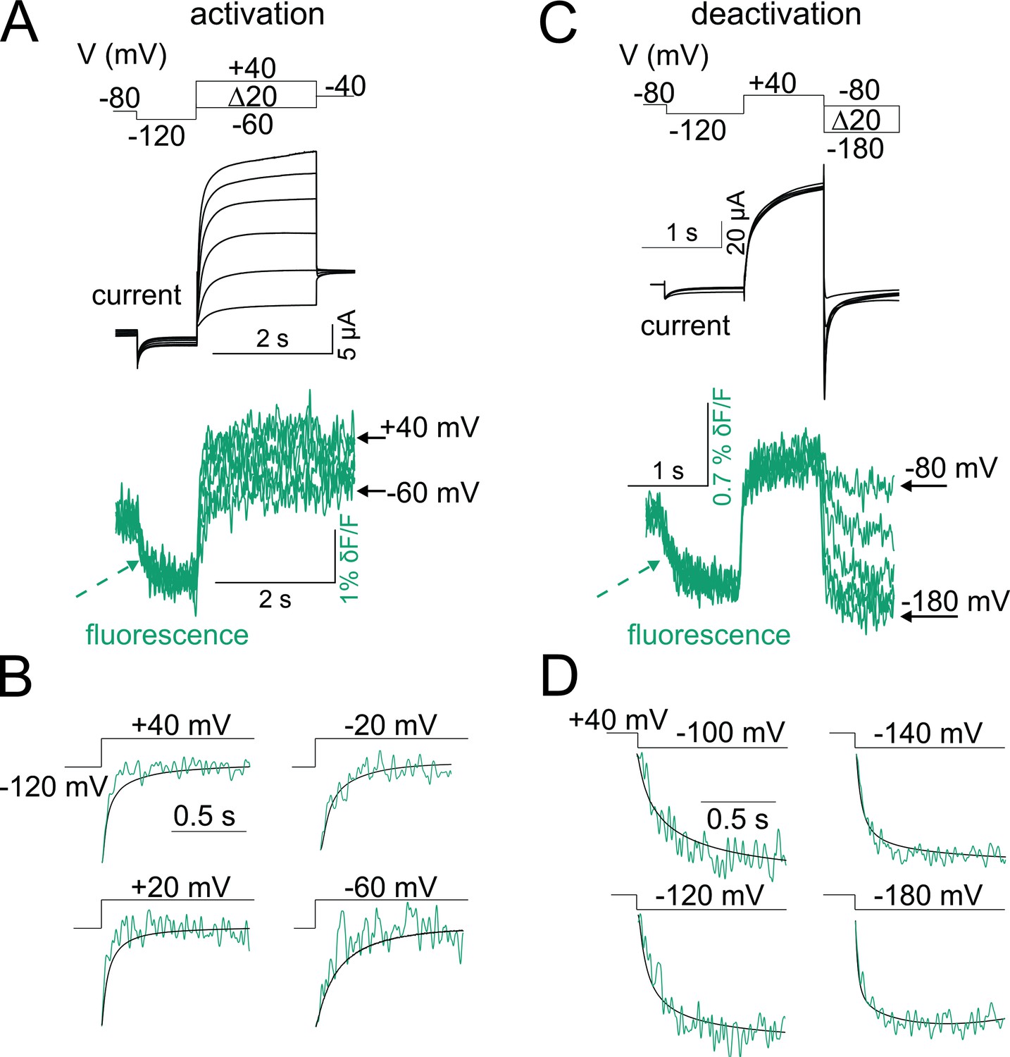 Figure 3. Fluorescence from KCNQ2* correlates with channel opening. (A–D) Representative current (black) and fluorescence (cyan) traces from KCNQ2* channels for the activation (A) and deactivation (C) voltage protocols (top). In response to the prepulse to −120 mV, the fluorescence signal decreases (cyan dashed arrow), indicating that not all voltage sensors were in their resting position at the holding potential (−80 mV). Representative experiments showing time courses of (B) activation and (D) deactivation of current (black) and fluorescence (cyan) signals from KCNQ2* channels at different voltages as in (A) and (C), respectively. Note that the current and the fluorescence signals correlate during both channel activation and deactivation. |