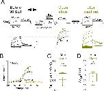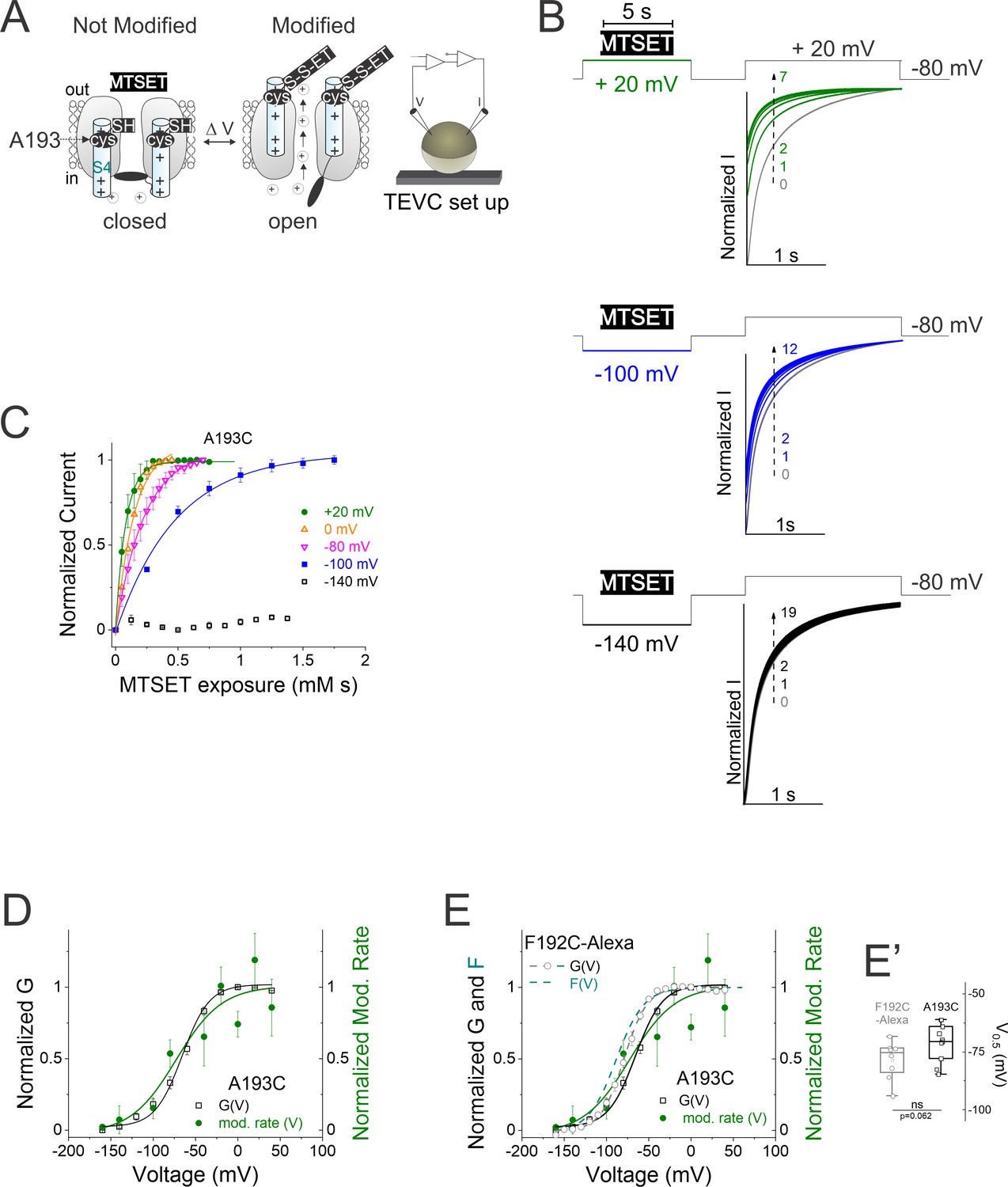 Figure 4. Accessibility of residue A193C supports voltage-dependent motion of S4 segment. (A) Cartoon representing extracellular cysteine accessibility of residue A193C as in Figure 1A. (B) Currents in response to +20 mV voltage steps before (gray trace #0) and during several 5 s applications of methanethiosulfonate (MTSET) at +20 mV (green traces #1–7), –100 mV (blue traces #1–12), and –140 mV (black traces #1–19) on A193C channels for the indicated voltage protocol. We repeat MTSET applications (10 μM at +20 and –100 mV, and 20 μM at –140 mV) in between 25 s washouts as shown in each voltage protocol. (C) Normalized current of A193C during MTSET exposure at +20 mV (green), 0 mV (orange), – 80 mV (pink), –100 mV (blue), and – 140 mV (black). (D and E) Normalized G(V) curves (squares and black line from a Boltzmann fit) of A193C channels and voltage dependence of the modification rate (mod. rate [V], green circles and green line from a Boltzmann fit) for MTSET to residue A193C. In (E), dashed lines represent ‘wt’ KCNQ2* (black) G(V) and (cyan) F(V) curves for comparison. (E’) Summary of G(V)1/2 for (open squares) A193C and (open gray circles) labeled F192C-Alexa channels. Data are presented as mean ± SEM, n=9–12. Statistical significance was determined using paired Student t-test and significance level was set at p<0.05, p=0.062. The midpoints of activation for the fits are: GV1/2A193C = – 70 ± 2.4 mV, (n=12) and GV1/2F192C-Alexa = –77.1 ± 2.7 mV, (n=9); Mod. rate V1/2 A193C = –72.8 ± 24.5 mV, (n=3–8); GV1/2A193C = – 70 ± 2.4 mV, (n=12); see Figure 2G for KCNQ2* GV1/2 and FV1/2, values. |