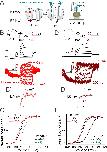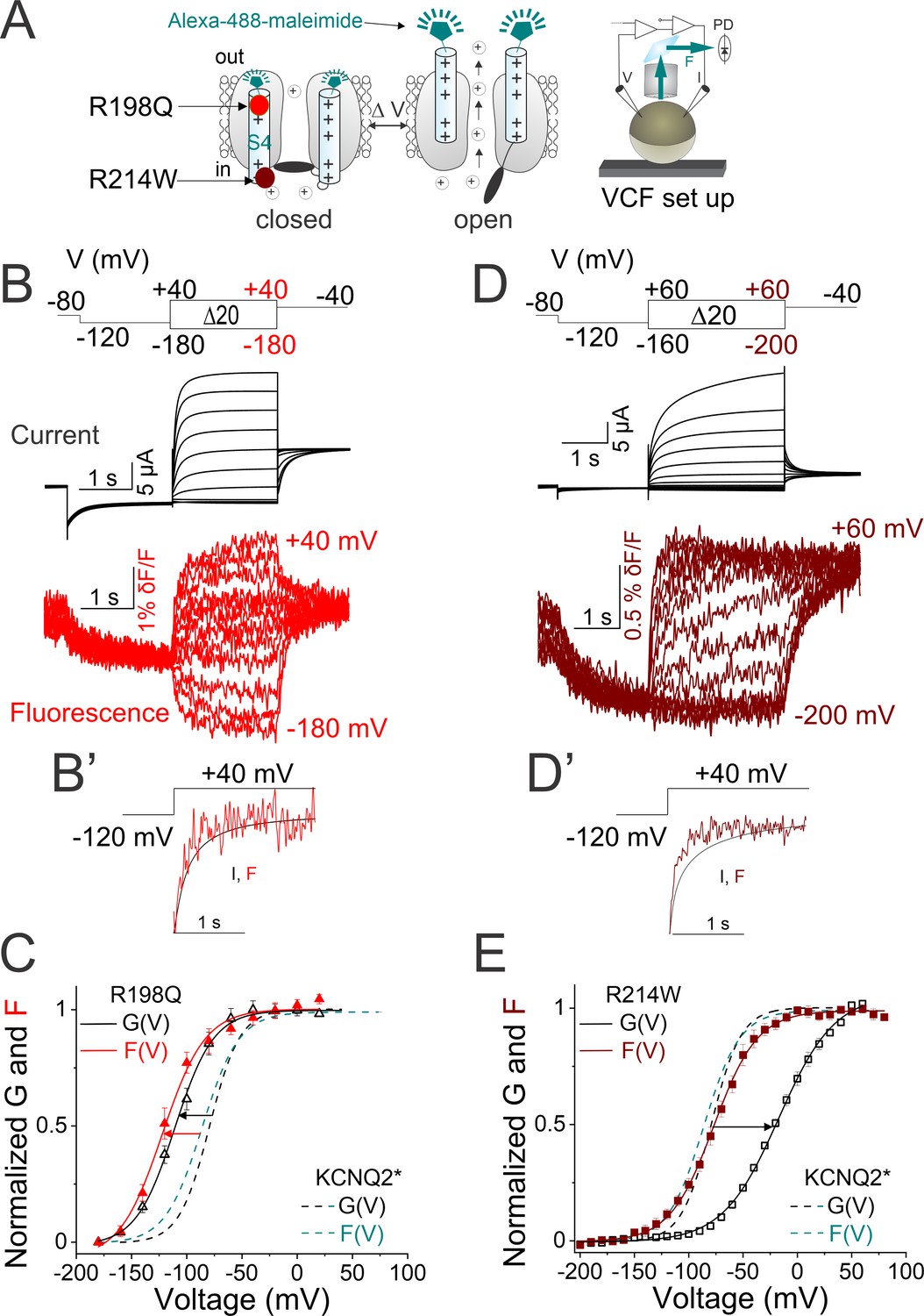 Figure 5. Disease-causing mutations in KCNQ2 channels differentially affect S4 and gate domains. (A) Cartoon representing the voltage-clamp fluorometry (VCF) technique as in Figure 2A. The localization of the two epilepsy-associated mutations - R198Q (red) and R214W (maroon) are shown. (B) Representative (black) current and (red) fluorescence traces from KCNQ2*-R198Q channels for the indicated voltage protocol (top). (Bâ) Comparison of the (black) time course of current activation and (red) fluorescence signals from KCNQ2*-R198Q channels in response to the voltage protocol shown. (C) Normalized G(V) (black triangles and black solid line from a Boltzmann fit) and F(V) (red triangles and red solid line from a Boltzmann fit) curves from KCNQ2*-R198Q. (D) Representative (black) current and (maroon) fluorescence traces from KCNQ2*-R214W channels for the indicated voltage protocol (top). (Dâ) Comparison of the (black) time course of current activation and (maroon) fluorescence signals from KCNQ2*- R214W channels in response to the voltage protocol shown. (E) Normalized G(V) (black squares and black solid line from a Boltzmann fit) and F(V) (maroon squares and maroon solid line from a Boltzmann fit) curves from KCNQ2*- R214W. (C and E) Dashed lines represent KCNQ2-F192C labeled with Alexa-488 (KCNQ2*) G(V) (black) and F(V) (cyan) curves for comparison. The same color code for the two KCNQ2 mutations is shown throughout the figure. The midpoints of activation of the fits are (GVR198Q 1/2 = â110.3 ± 3.5 mV, (n=10), FVR198Q 1/2 = â119.8 ± 4.2 mV, [n=4], GV214W 1/2 = â17.1 ± 0.9 mV, [n=8], and FVR214W 1/2 = â 77 ± 0.6 mV, [n=7]) and in Supplementary file 1. Data are mean ± SEM. |