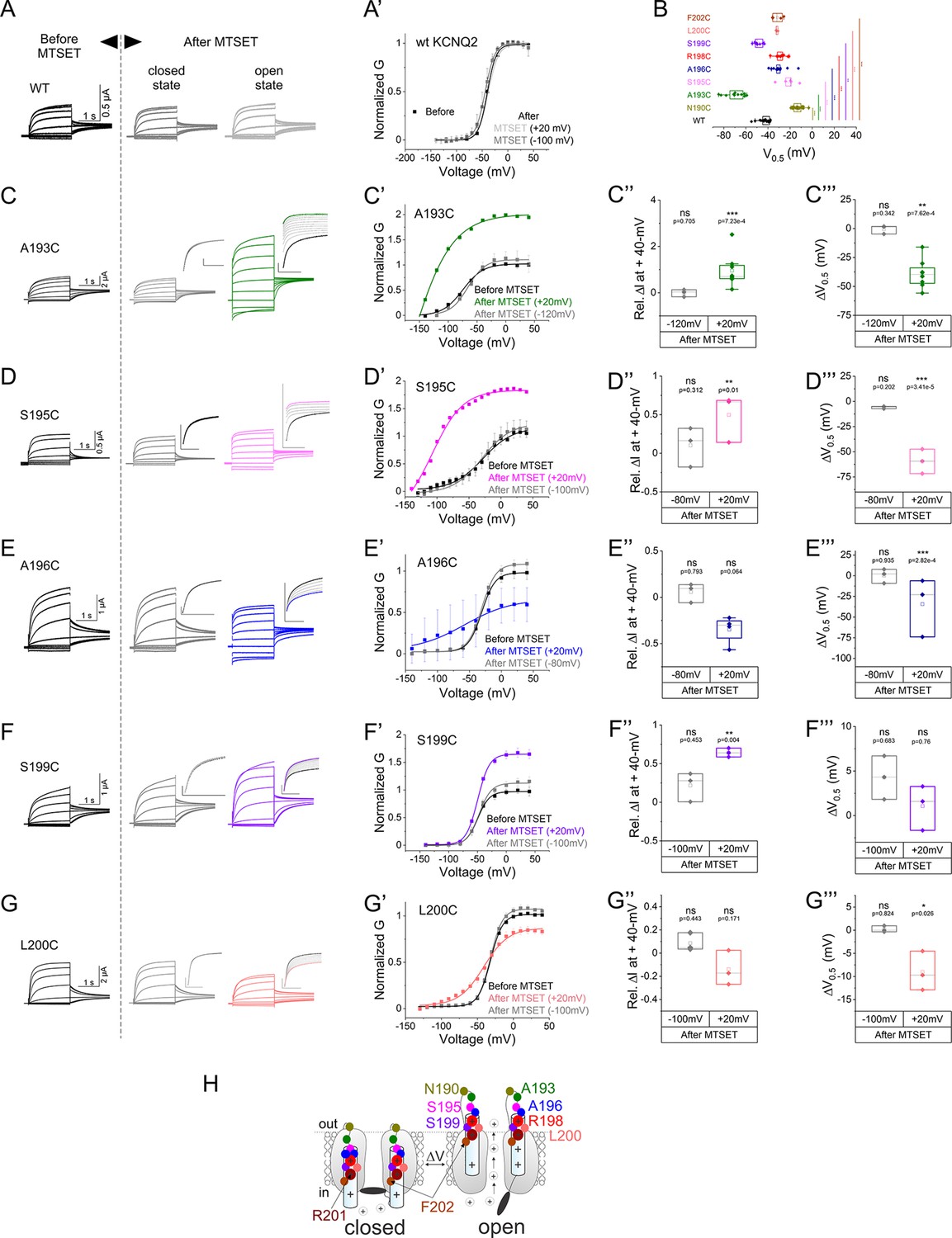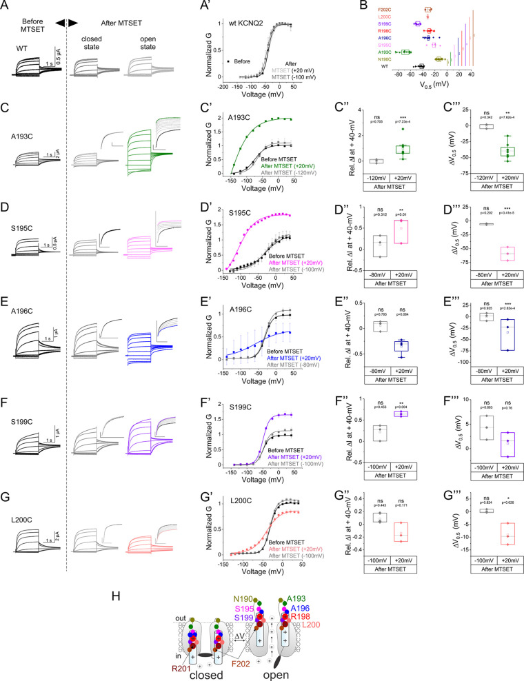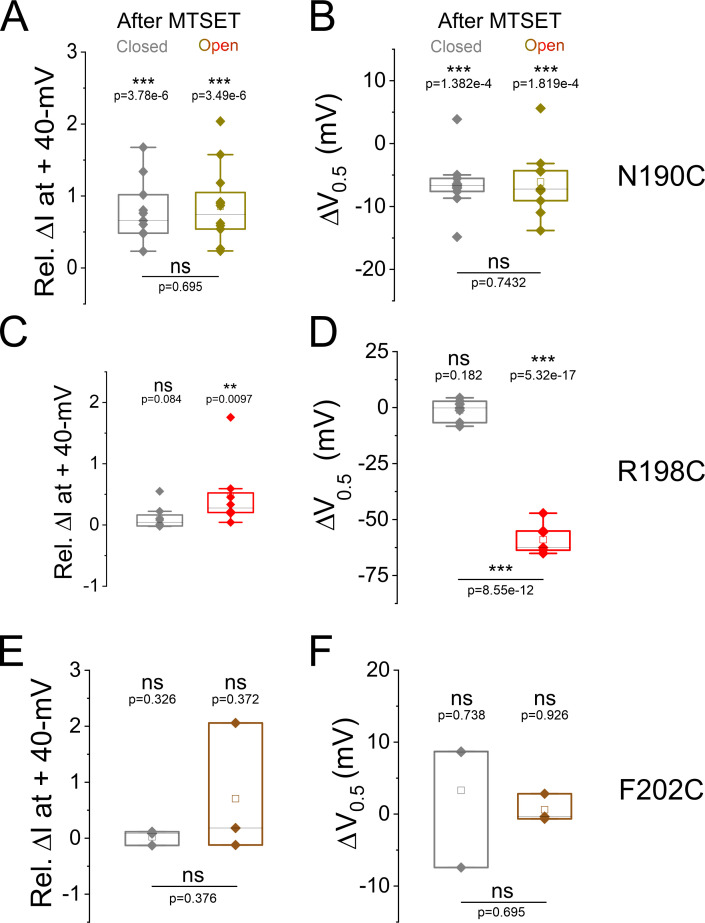 Figure 1—figure supplement 3. Summary of modification of N190C, R198C, and F202C in the closed and open states by external methanethiosulfonate (MTSET).Summary of (A, C, and E) relative change in current amplitude at +40 mV and (B, D, and F) voltage of half activation shift of MTSET-mediated modification of the cysteine mutants in (gray) the closed and (color-coded) open states. Mean ± SEM, n=3–24. Statistical significance was determined using the paired Student’s t-test and significance level was set at p<0.05. Asterisks denote significance: p<0.01**, p<0.001***. |