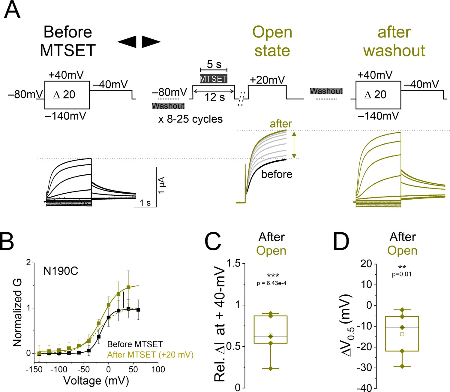 Supplementary Figure 4. Modification of N190C in the open state by external methanethiosulfonate (MTSET). (A) Currents from oocytes expressing KCNQ2-N190C channels in response to 20 mV voltage steps from â140 mV to +40 mV (black) before and (yellow) after application of MTSET in the open state. The middle panel in (A) shows currents in response to a +20 mV voltage step during MTSET application on N190C channels in the open state for the indicated voltage protocol. MTSET is applied at +20 mV for 5 s in between 25 s washouts for 8â15 cycles, and the change in current is measured at +20 mV. (B) Steady-state conductance/voltage relationships, G(V), (lines from a Boltzmann fit) of N190C channels normalized to peak conductance before MTSET application (black). The G(V) relationships of N190C channels before and after MTSET application in the open state (+20 mV, yellow) are obtained from recordings of (A, left and right panels, respectively). Summary of (C) relative change in current amplitude and (D) voltage dependence shift of MTSET-mediated modification of N190C channels in the open state. Mean ± SEM, n=5â24. Statistical significance was determined using the paired Studentâs t-test (from before) and significance level was set at p<0.05. Asterisks denote significance: p<0.01**. |