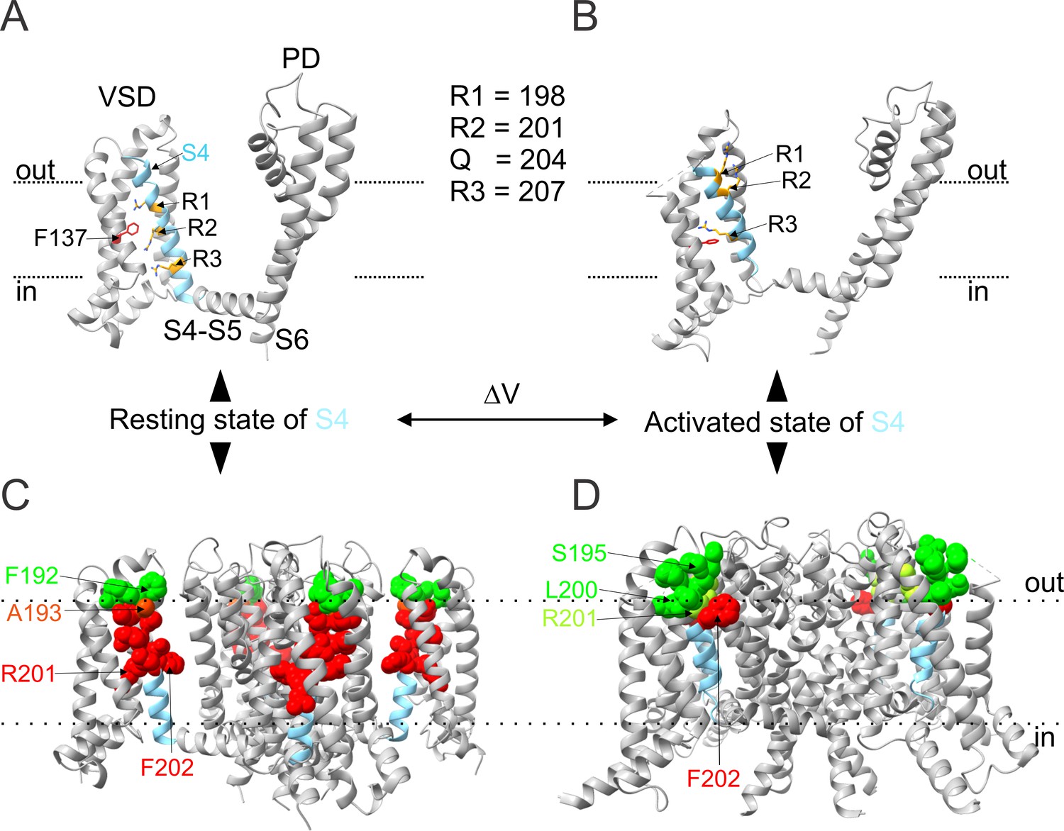 Supplementary Figure 5. Proposed molecular motions of S4 residues in KCNQ2 channels. (A and C) KCNQ2 homology model in the closed resting state (S4 down) and (B and D) cryo-EM structure of KCNQ2 channel in the activated state of S4 (up) and closed pore. The homology model of KCNQ2 channels with S4 in the resting (down) state was created using the Swiss-model program (https://swissmodel.expasy.org/) with the model of KCNQ1 in the resting state (Kuenze et al., 2019), as template. The homology model of KCNQ2 channels with S4 in the activated (up) state (Li et al., 2021b): PDB code for KCNQ2: 7CR0. (A) In the resting state, R1 and R2 in S4 (cyan) localize above and below the gating charge transfer center F137 (red stick), respectively. (B) Upon S4 activation, R1 and R2 move about three helical turns outward from F137 into a position close to or within the extracellular space. One subunit is shown as ribbons and key amino acid residues as sticks. (CâD) Proposed molecular motions of S4 residues from (C) resting to (D) activated states from cysteine accessibility data. A buried (red spheres) stretch of eight to nine amino acids (193 to 200â201) in the resting state (C) becomes exposed to the extracellular space (green spheres) in the activated state (D). The four subunits are shown as ribbons and buried and extracellularly exposed residues in the S4 are shown as red and green spheres, respectively. Dotted lines indicate the proposed inner and outer lipid bilayer boundary. All images were generated using UCSF ChimeraX, version 1.1 (2020-10-07). VSD: voltage sensing domain; PD: pore domain. |