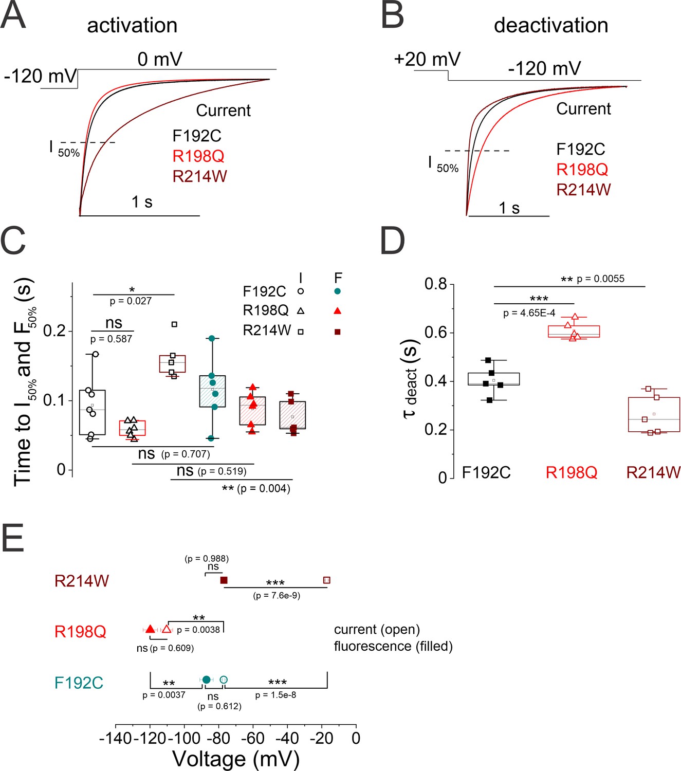 Supplementary Figure 7. Gating properties of the epilepsy-associated mutations - R198Q and R214W. (A, B) Representative normalized current time courses of (A) activation and (B) deactivation from labeled (black) F192C, (red) R198Q ,and (maroon) R214W mutated channels in response to the indicated voltage steps. The dashed lines in (A) and (B) represent 50% of the normalized current levels at the end of the pulse. (C) Summary of the time courses of (open symbols) current and (filled symbols) fluorescence is quantified as the time to reach 50% maximum level at the end of the depolarizing pulse as in (A and the fluorescence, inset). (D) Summary of Tau values for deactivation of current for (black) F192C, (red) R198Q, and (maroon) R214W, respectively. (E) Summary of (open symbols) G(V)1/2 and (filled symbols) F(V)1/2 values for the (cyan) F192C, (red) R198Q, and (maroon) R214W. Data is presented as mean ± SEM, n=8â11. Statistical significance was determined using ANOVA and Tukeyâs post hoc test, and significance level was set at p<0.05. Asterisks denote significance: p<0.05*. |