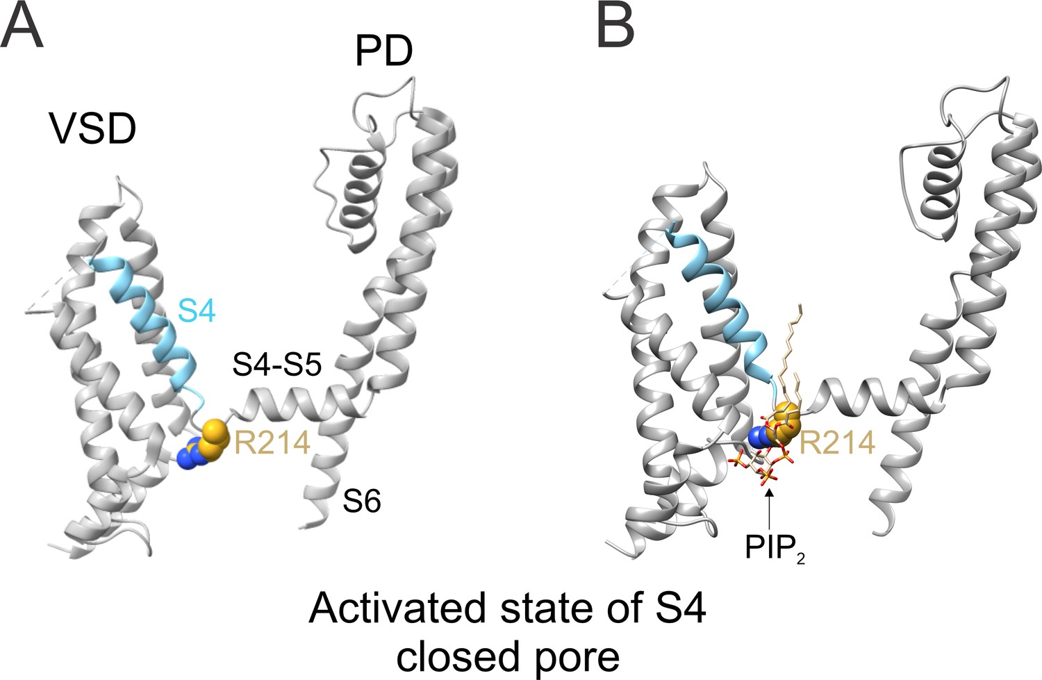 Supplementary Figure 8. PIP2 tightly joints the loop connecting S4 and S4âS5 linker to facilitate channel opening. Cryo-EM structure of KCNQ2 channel in the activated state (S4 [up] and closed pore showing (A) the localization of residue R214 [sphere] in the loop connecting S4 [cyan] and S4âS5 linker, and (B) the position of PIP2 relative to R214 within the S4/S4âS5 interface of KCNQ2 channels). PDB code for KCNQ2: 7CR0. All images were generated using UCSF ChimeraX, version 1.1 (2020-10-07). |