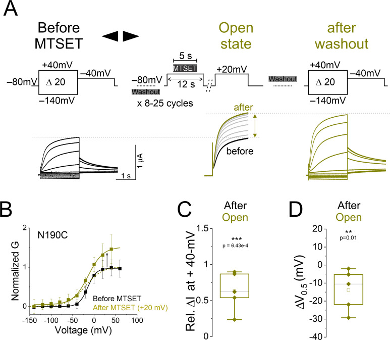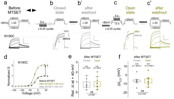 Author response image 2. (a, b’, and c’) Currents from oocytes expressing KCNQ2-N190C channels in response to 20-mV voltage steps from – 140-mV to + 40-mV (a) before and after application of MTSET in the (b’) closed and (c’) open states.(b and c) currents in response to a + 20-mV voltage step during MTSET application on N190C channels in the (b) closed and (c) open states for the indicated voltage protocols. MTSET is first applied at (b) – 80 mV for 5-s in between 25-s washouts for 8-15 cycles and the change in current is measured at + 20-mV. On the same cell and after MTSET is washed out of the bath, MTSET is re-applied at (c) + 20-mV using a similar protocol as in (b). (d) Normalized steady-state conductance/voltage relationships, G(V), (lines from a Boltzmann fit) of N190C channels normalized to peak conductance before MTSET application (black). The G(V) relationships of N190C channels before and after MTSET application in the closed (-80-mV, gray) and open (+ 20-mV, yellow) states are obtained from recordings of panels (a), (b’), and (c’), respectively. Summary of (e) relative change in current amplitude and (f) voltage dependence shift of MTSET-mediated modification of N190C channels in the (gray) closed and (yellow) open states. Mean ± SEM, n=9-24. Statistical significance was determined using the Student’s t-test and significance level was set at P < 0.05. Asterisks denote significance: p < 0.001***. |
